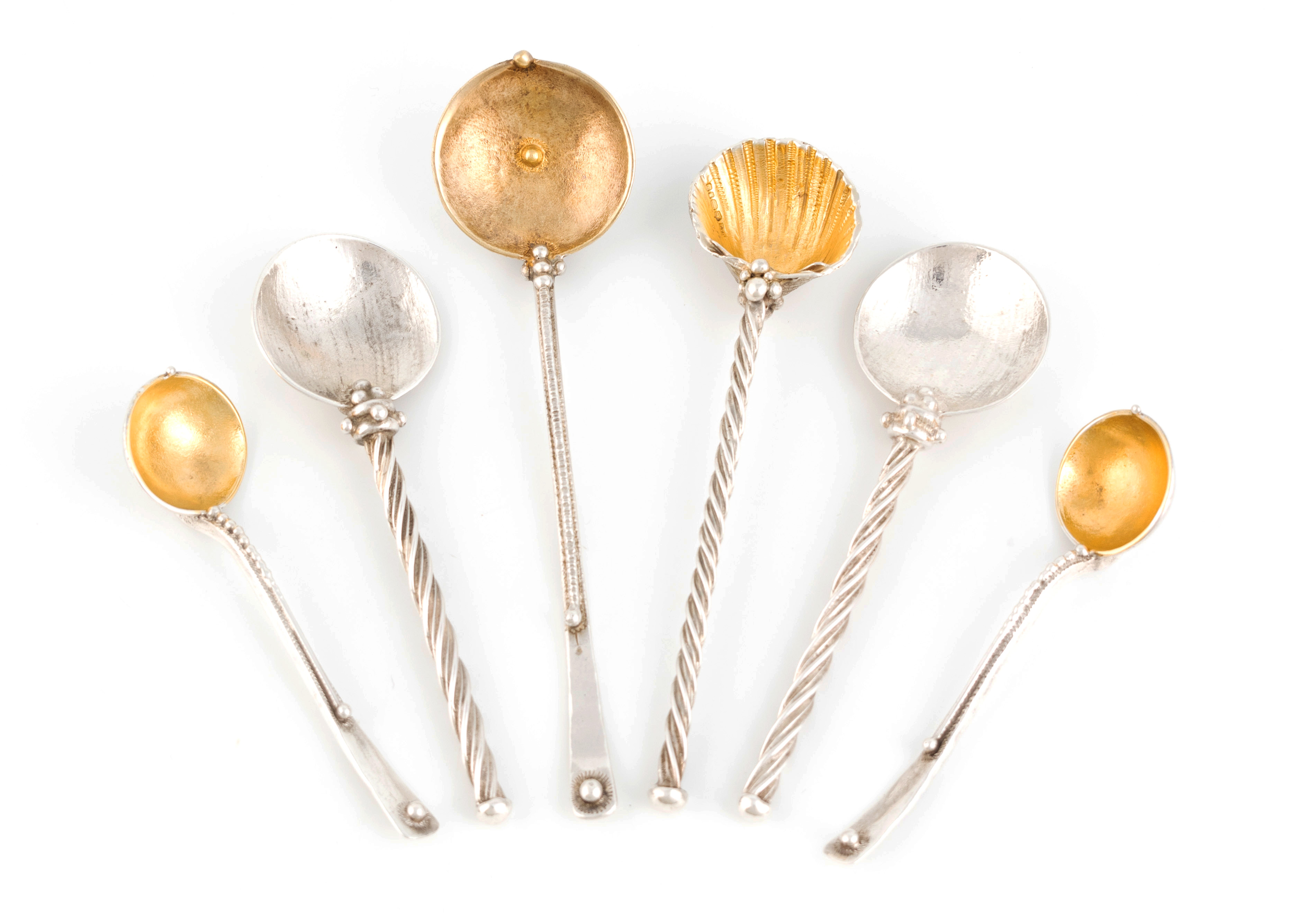 comprising: a pair of salt spoons, a pair of condiment spoons, a spoon with a shell bowl and another condiment spoon, length 13.5cm, total approx. weight 4.4oz. (6)