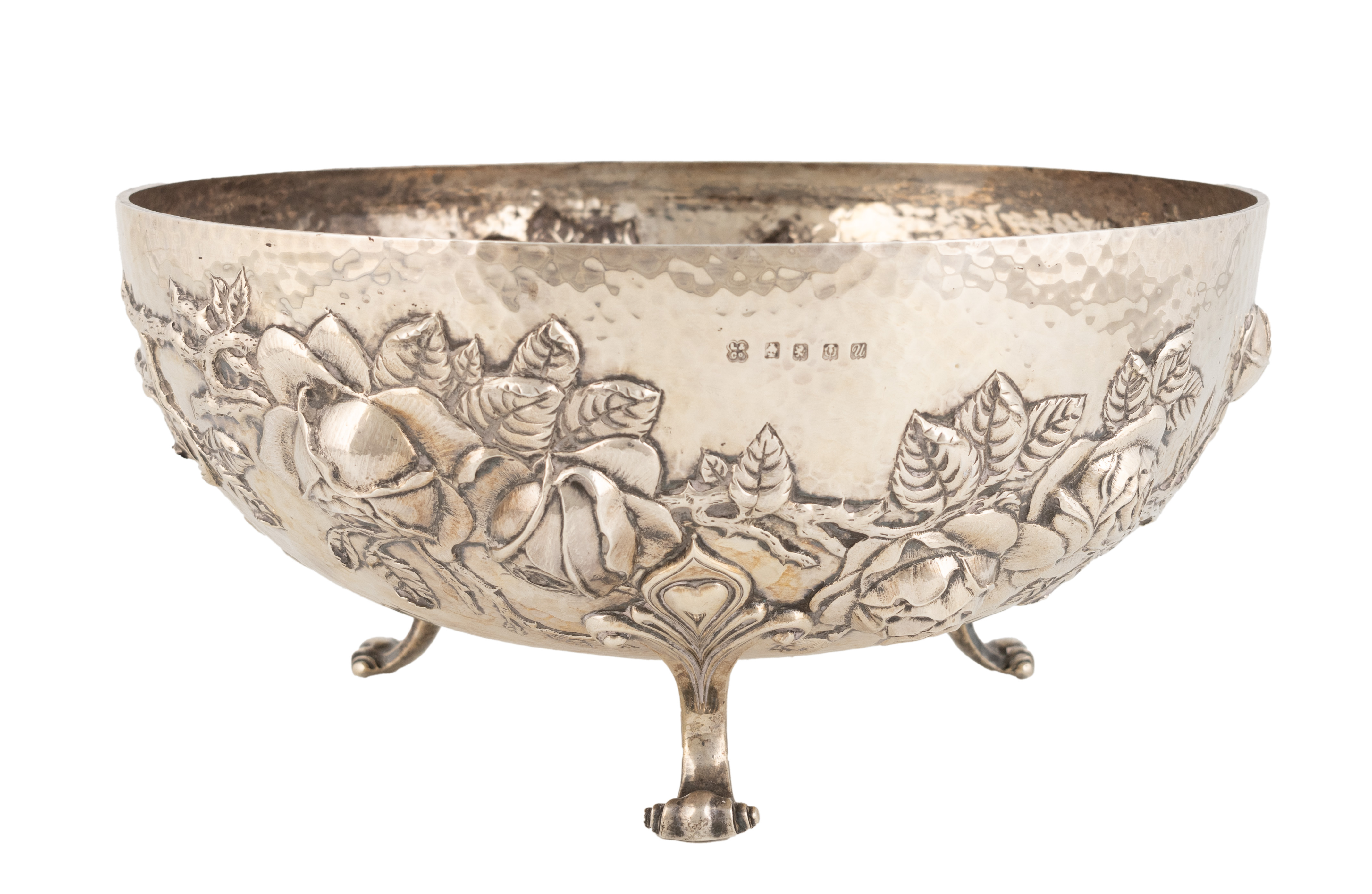 circular form with spot-hammered decoration and embossed rose decoration, on three scroll feet, diameter 25.5cm, approx. weight 26.5oz.