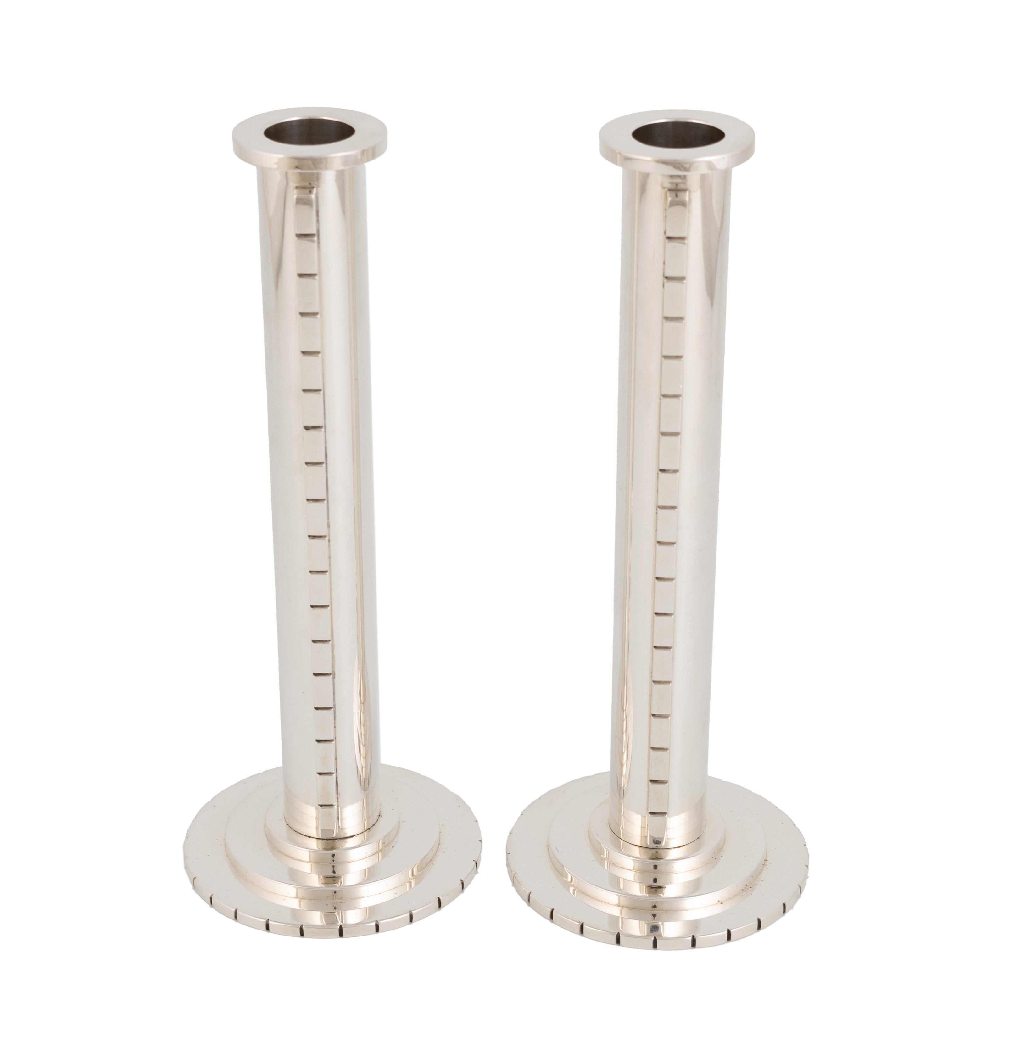 plain circular form with notched strips running down the stem, on stepped circular bases with notches, height 20cm, total approx. weight 38.8oz. (2)