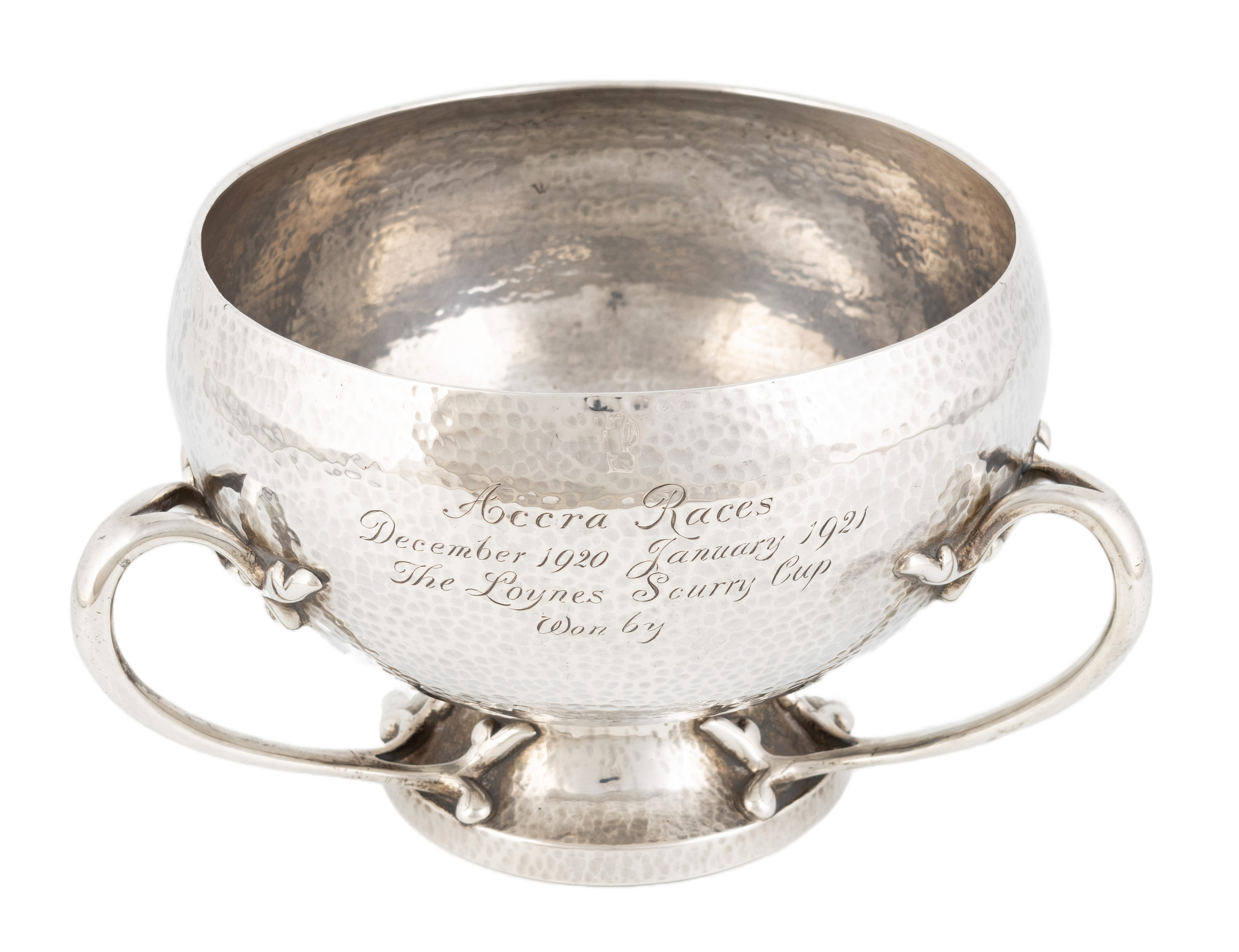 circular form, spot-hammered decoration, bifurcated scroll handles, with a presentation inscription, diameter 18cm, approx. weight 31oz.