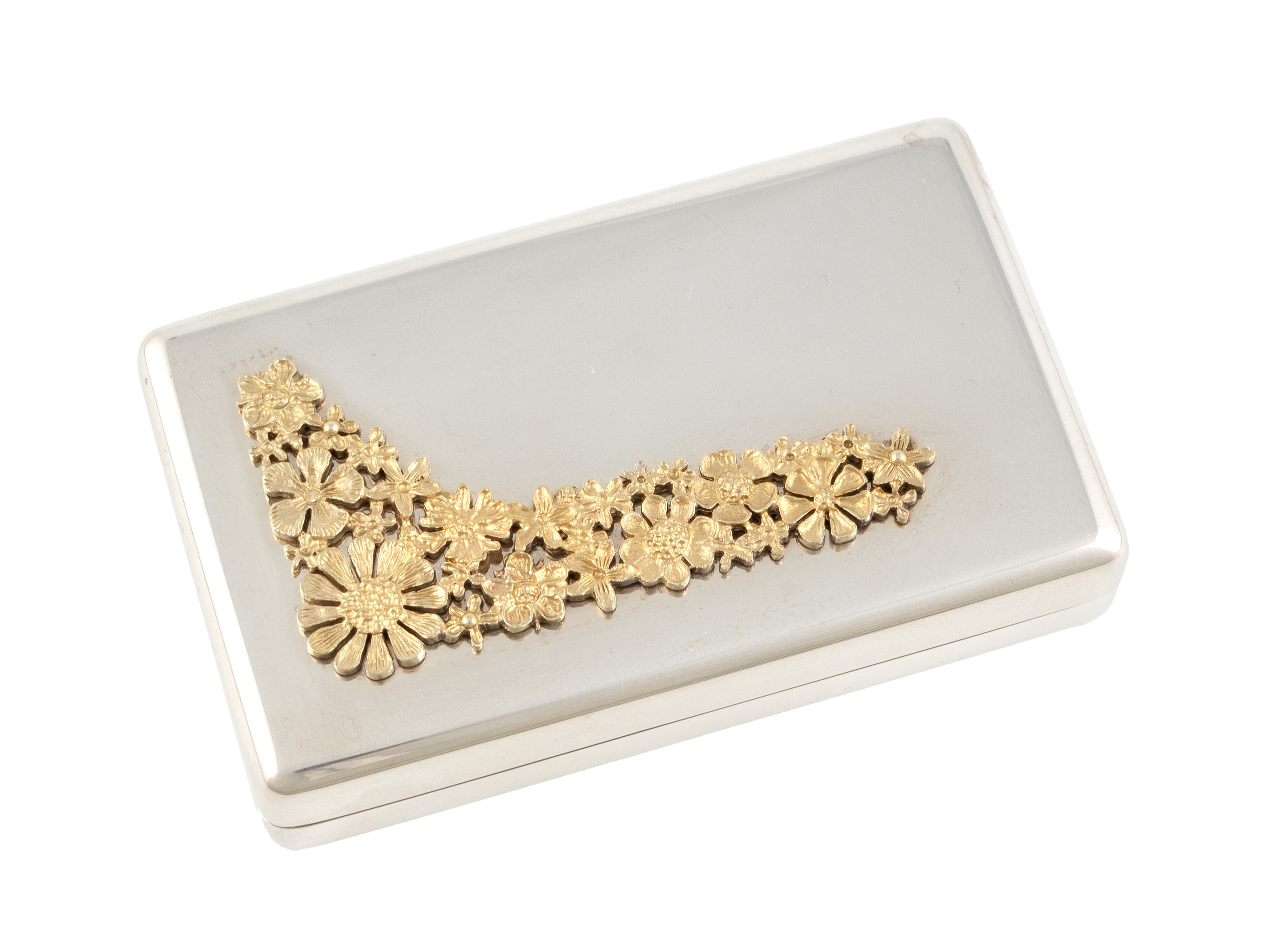 rounded rectangular form, the hinged cover applied with a silver-gilt floral spray, length 9.6cm, approx. weight 5.2oz.