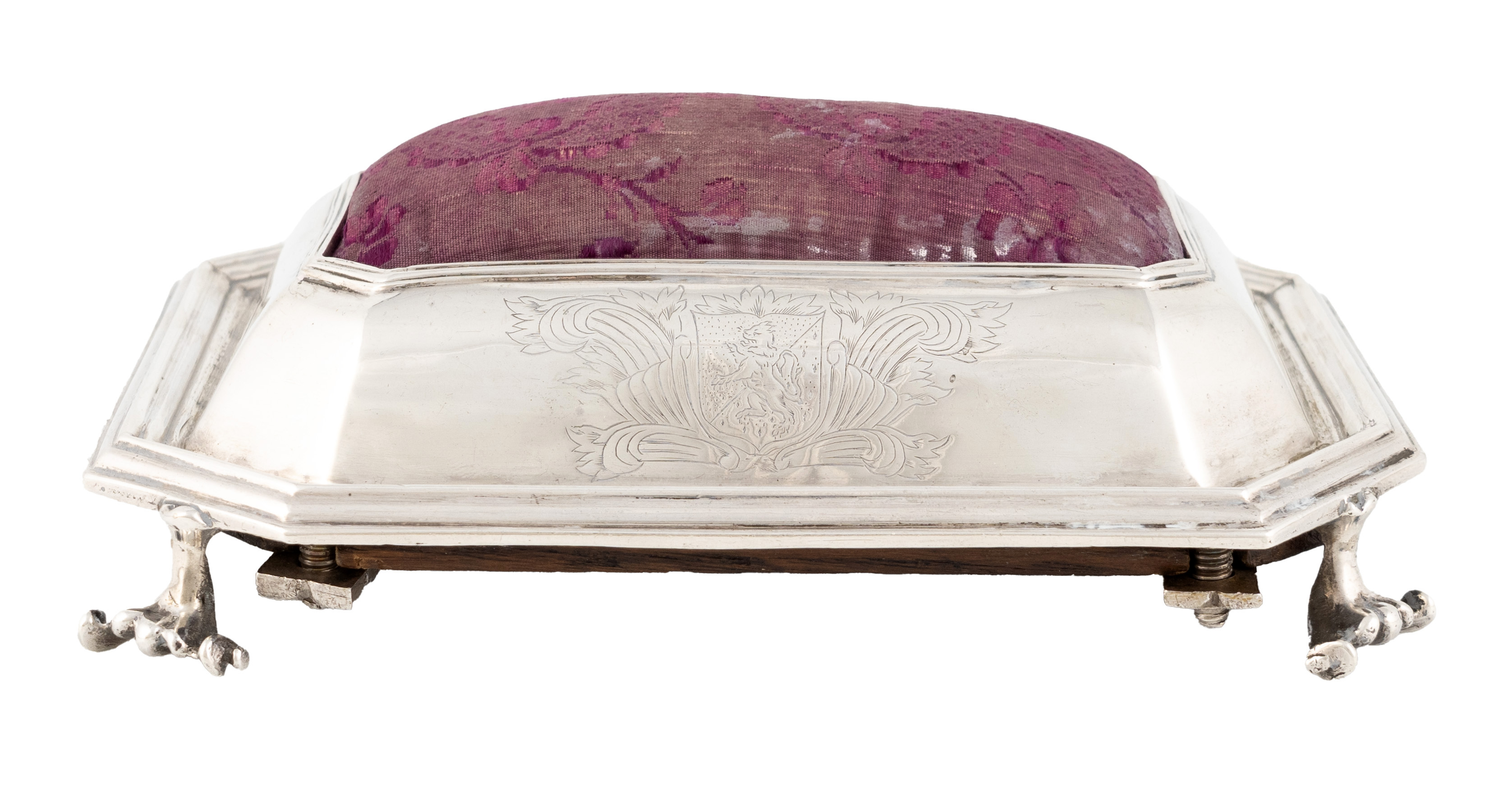 rectangular form, canted corners, engraved with an armorial shield with feather mantling, on four gnarl feet, length 16.5cm, approx. weight 9.5oz.