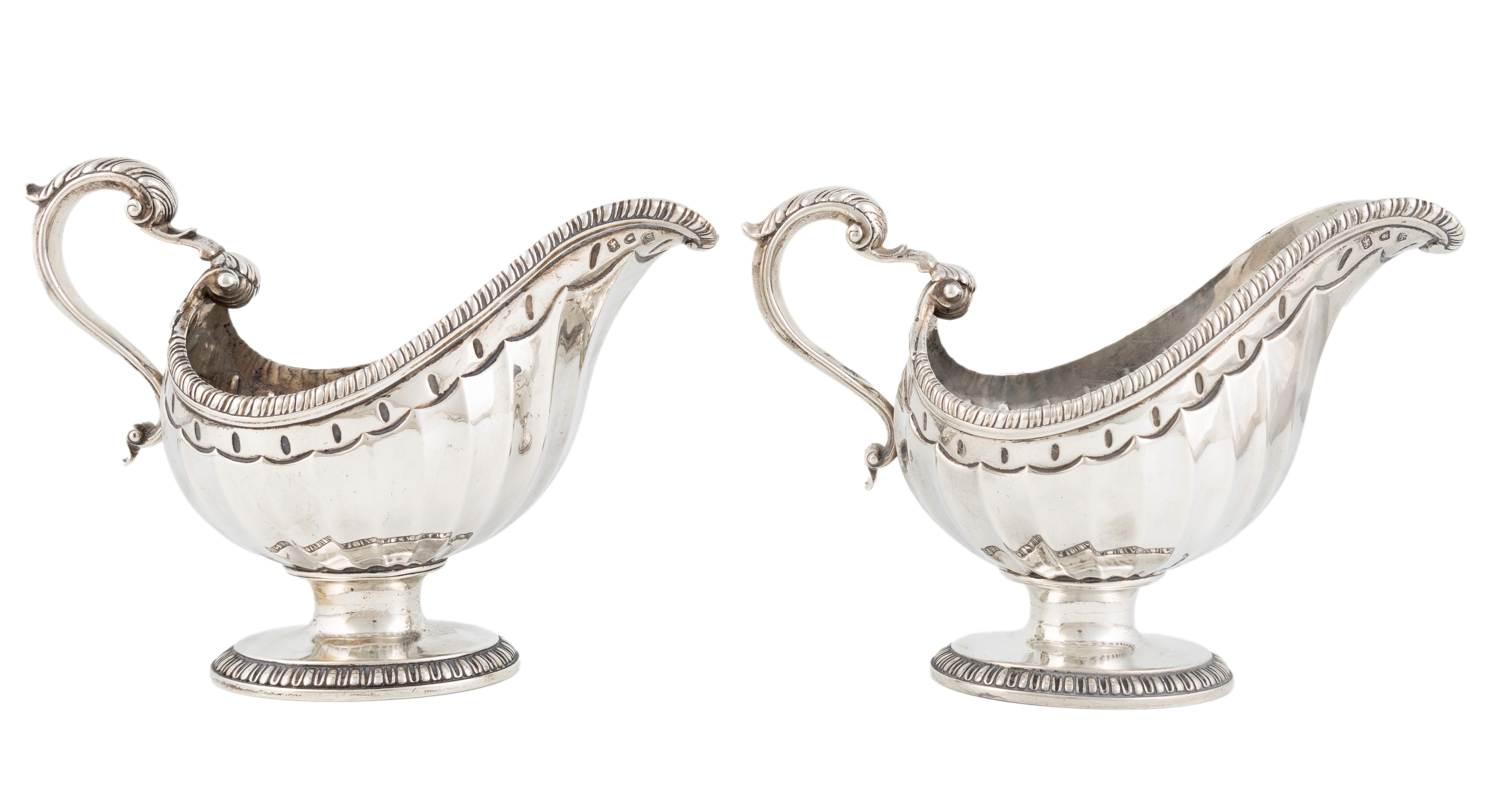 oval fluted form with a gadrooned border, acanthus leaf-capped scroll handle, on oval feet, length handle to spout 22cm, total approx. weight 42.1oz. (2)