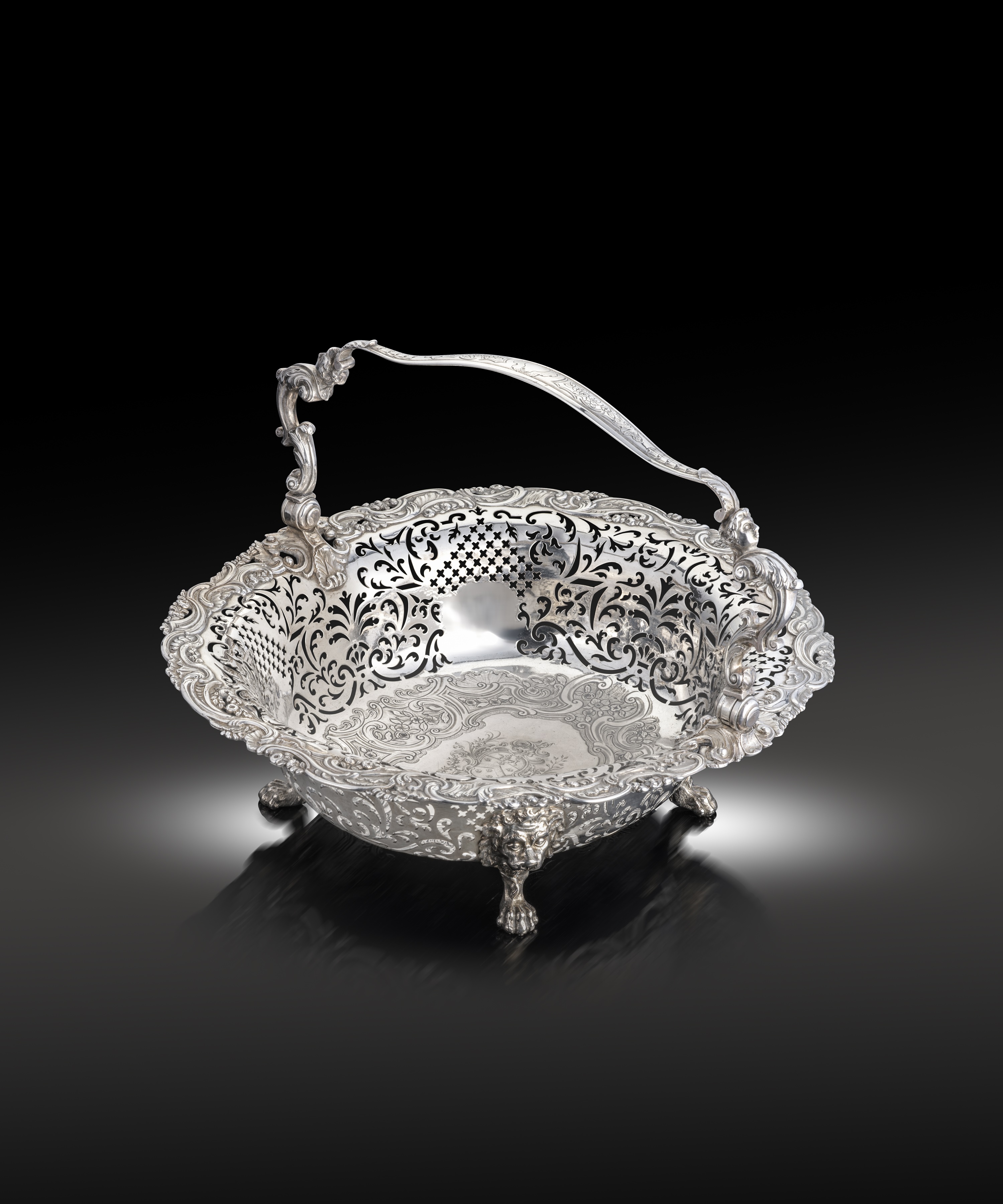 oval form, pierced with mullets and scroll decoration, with a pierced and chased border of shell and scroll foliate decoration, swing-handle decoration with scroll foliate and capped with female masks, on four lion mask capped paw feet, engraved with an armorial shield within foliate scroll mantling, length 35cm, approx. weight 57.3oz.