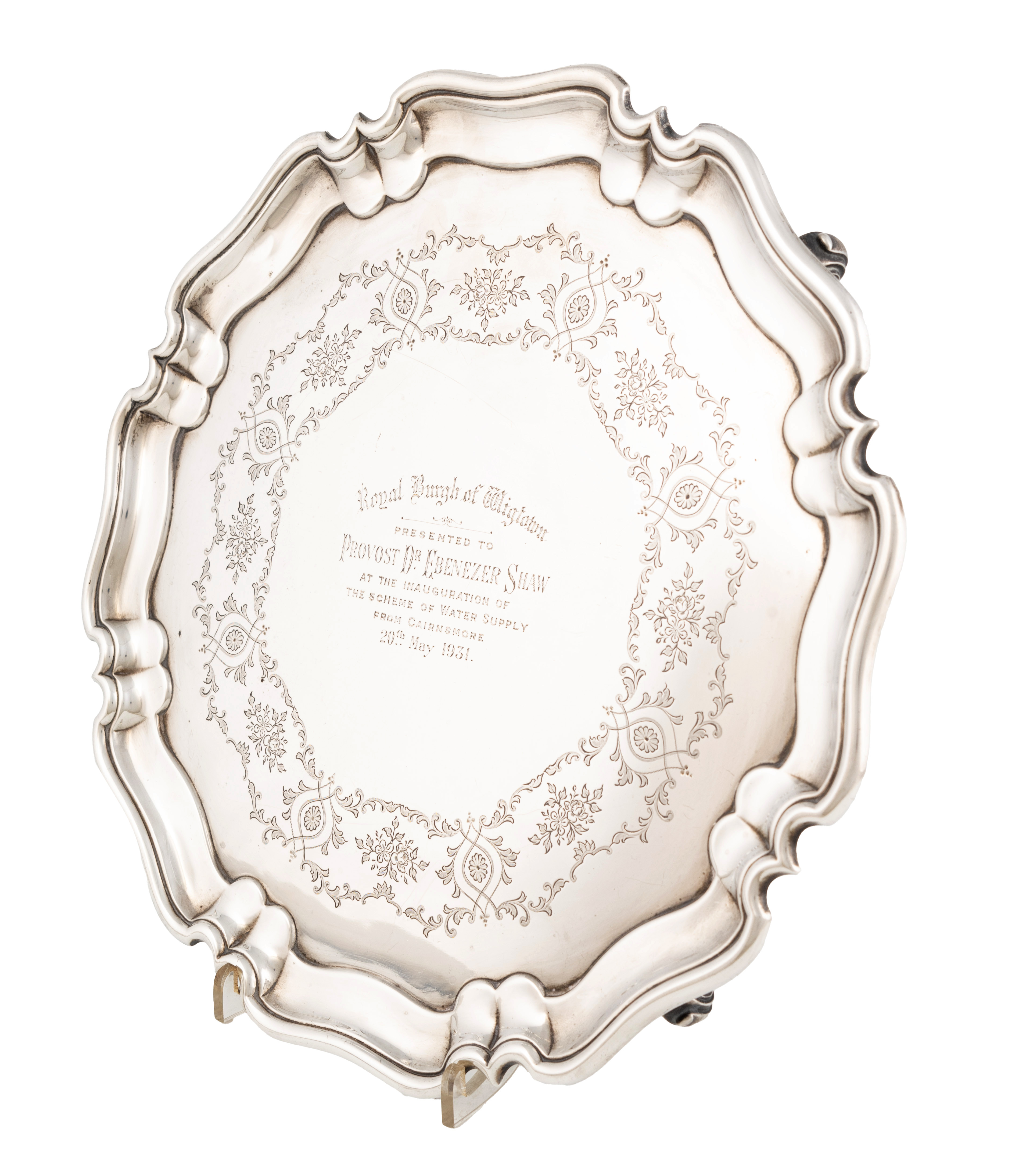 circular shaped with a moulded scalloped edge border, engraved with foliate decoration and inscribed 'Royal Burgh of Wigtown, Presented to Provost Dr Ebenezer Shaw at the inauguration of the scheme water supply from Cairnsmore 20th May 1931', on four gnarl feet, diameter 31.4cm, approx. weight 30.1oz.