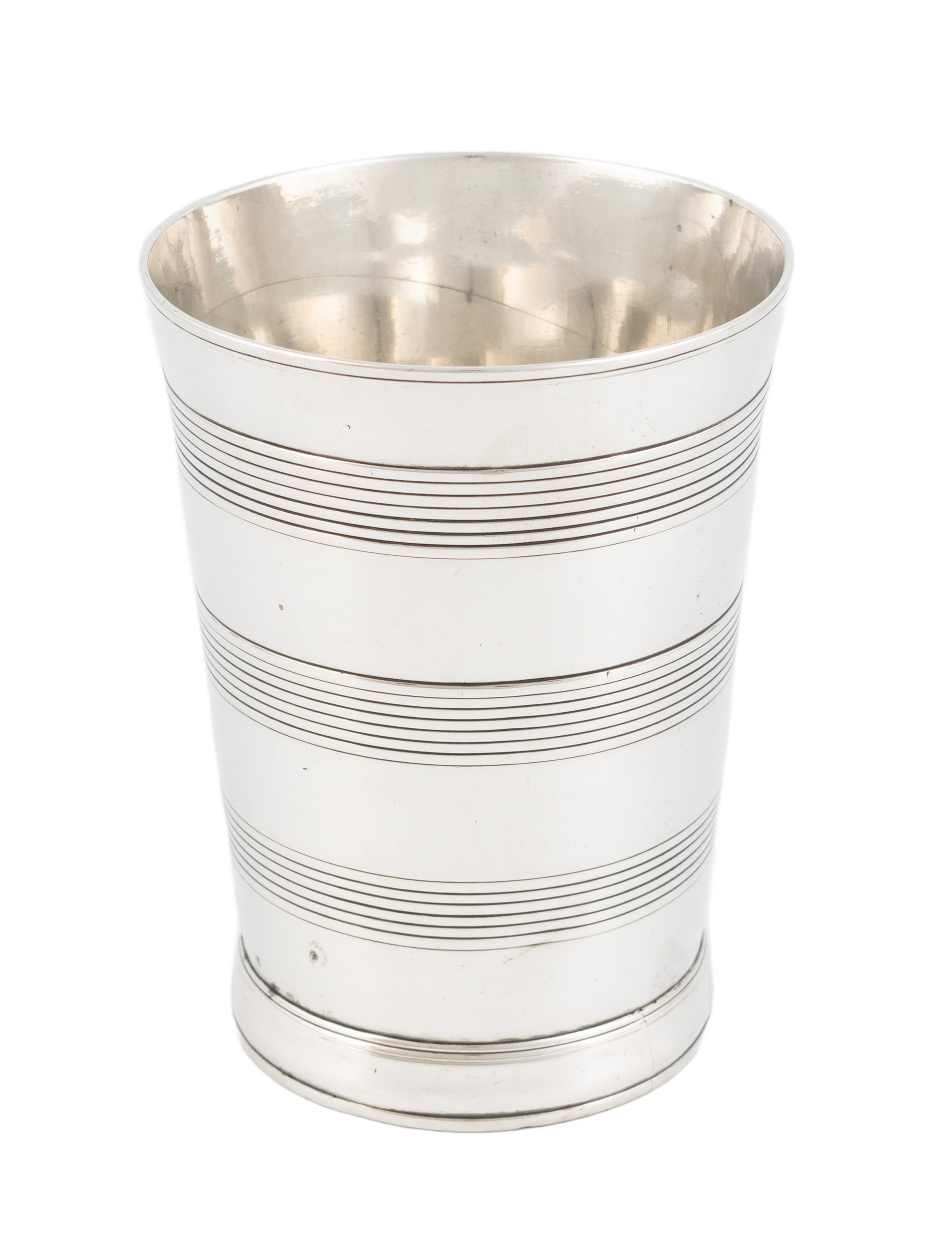 tapering circular form with bands of reeded decoration, height 10.2cm, approx. weight 4.6oz.