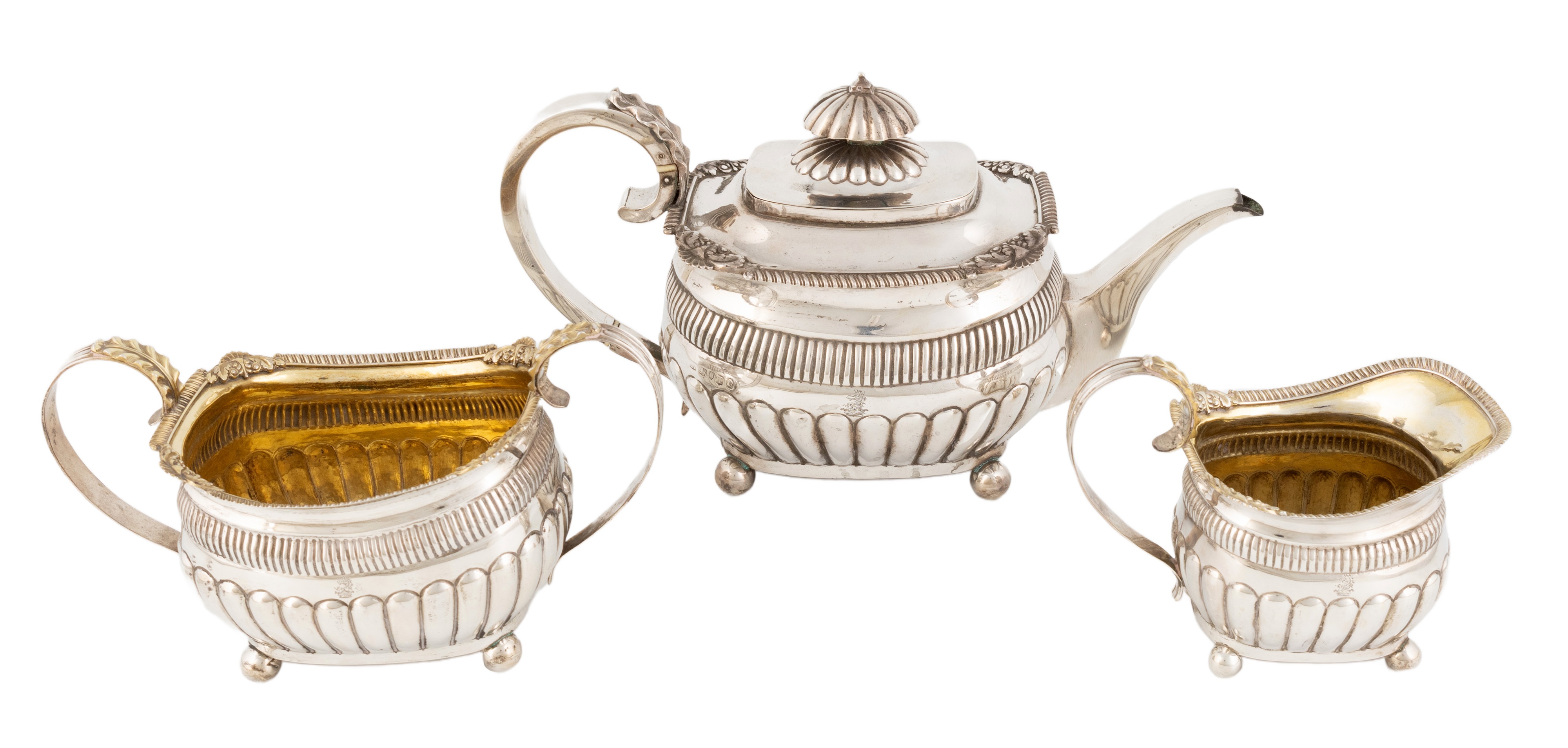 circular form with part-fluted decoration, gadrooned scroll foliate borders, ivory insulators to the teapot's scroll handle, on four ball feet, length handle to spout 29.5cm, total approx. weight 38.7oz. (3)