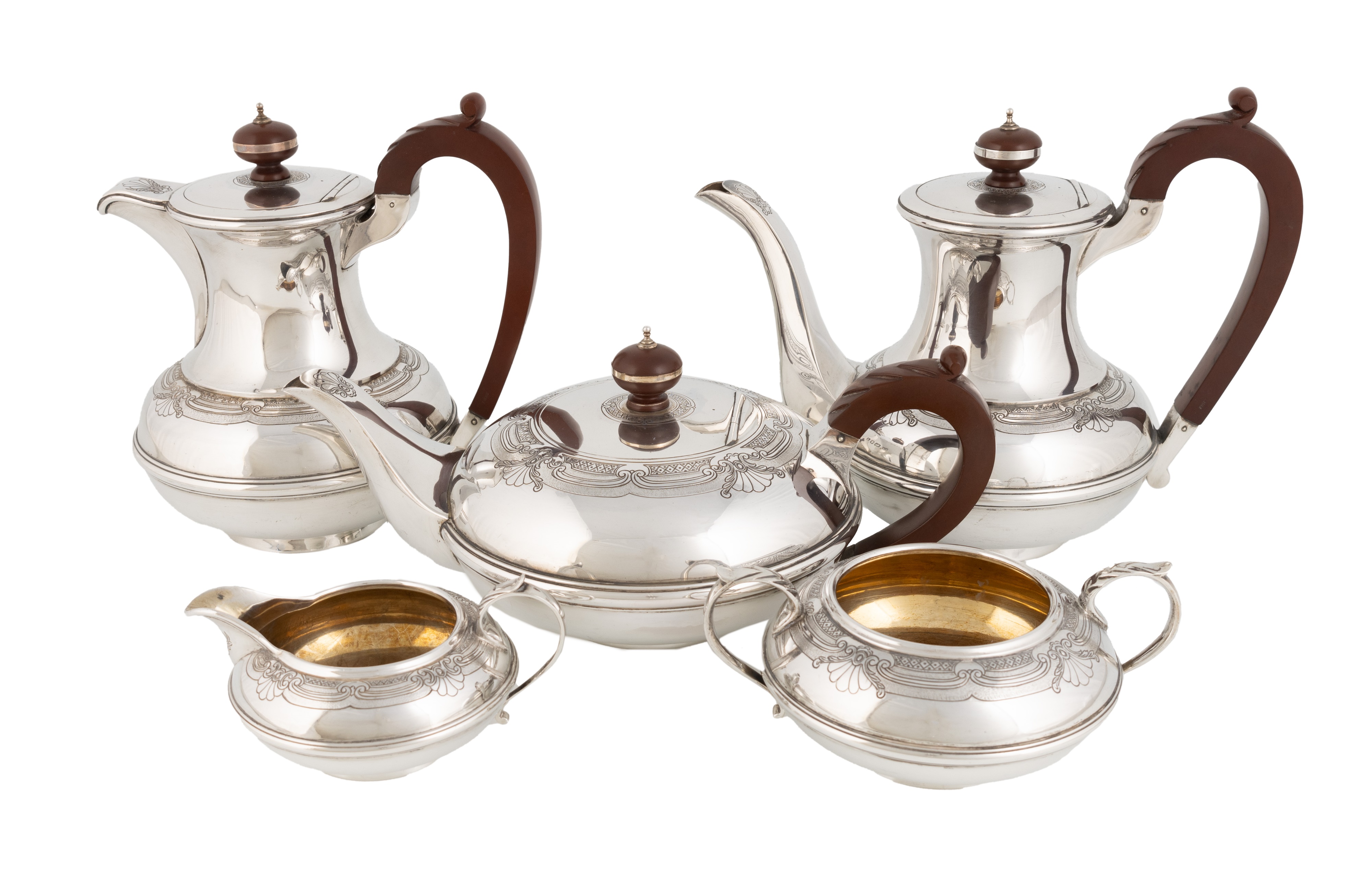 compressed circular and baluster form, chased scroll and fish scale decoration, leaf-capped scroll handles, height of coffee pot 20cm, approx. weight 95oz. (5)