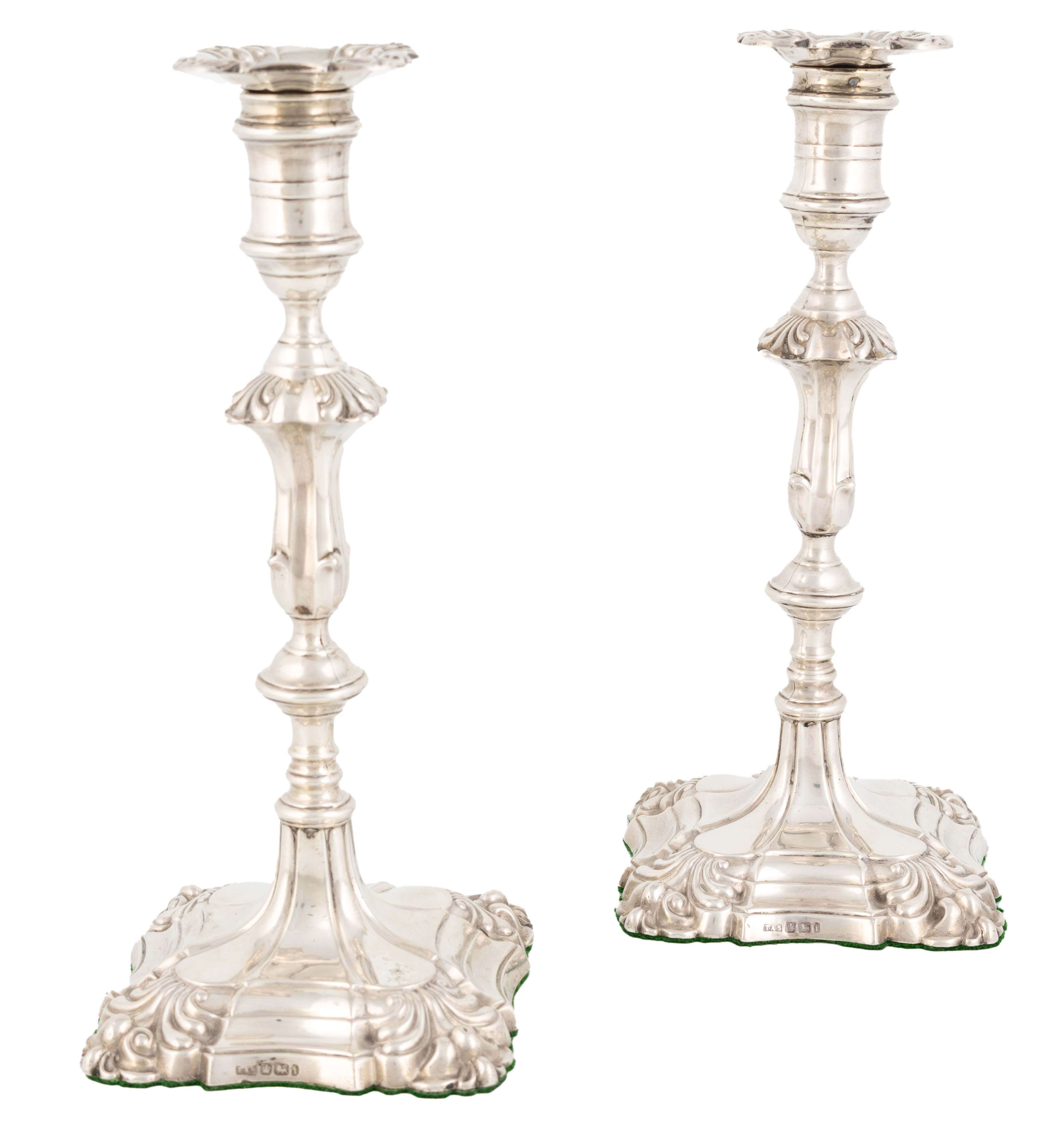 knopped baluster form with scroll decoration, on stepped square-shaped loaded bases, height 24.1cm. (2)