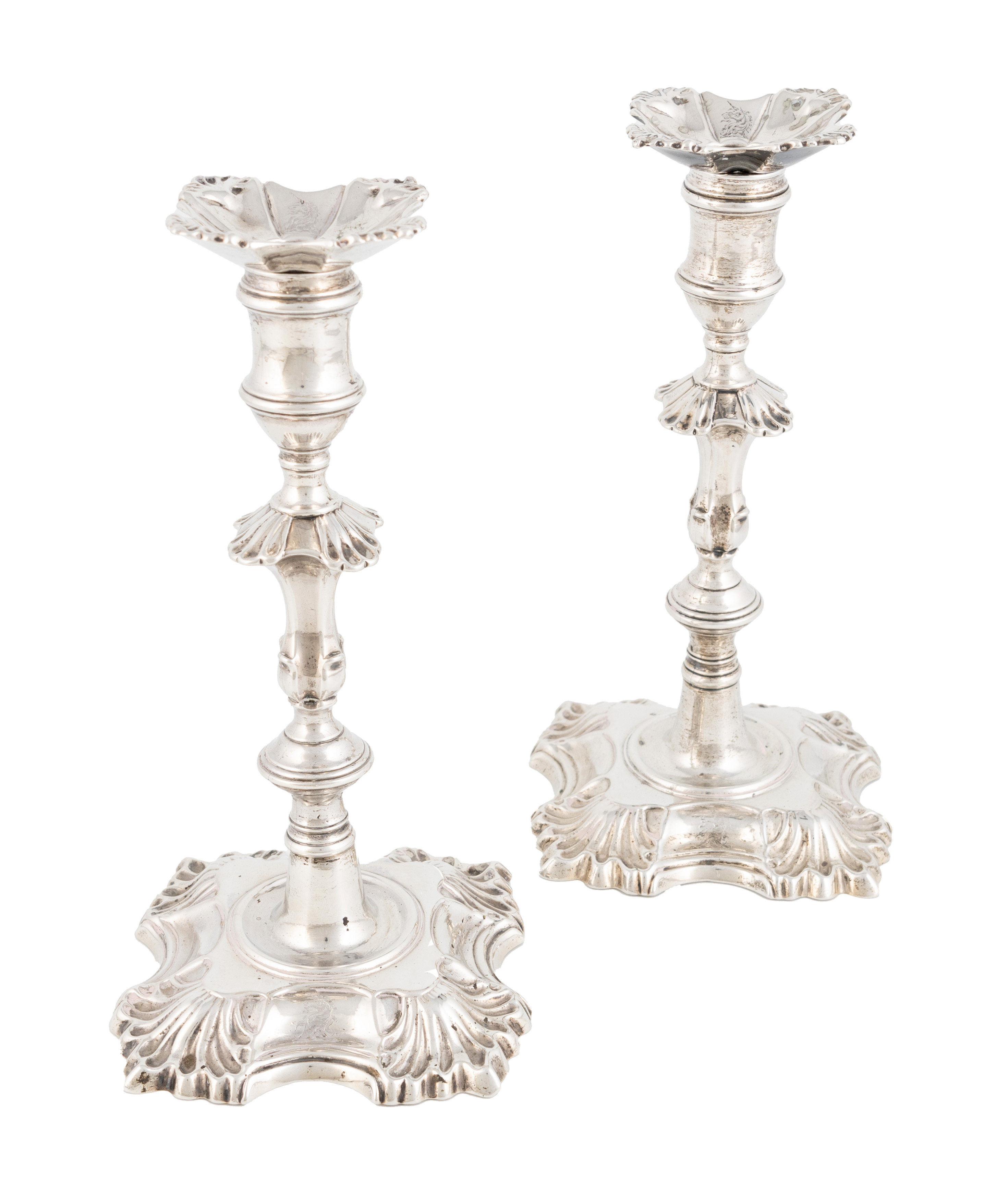 knopped baluster columns, shell shoulders, spool-shaped capitals, detachable drip pans engraved with crests, on raised square bases with shell motifs, height 21.4cm, total approx. weight 29.6oz. (2)