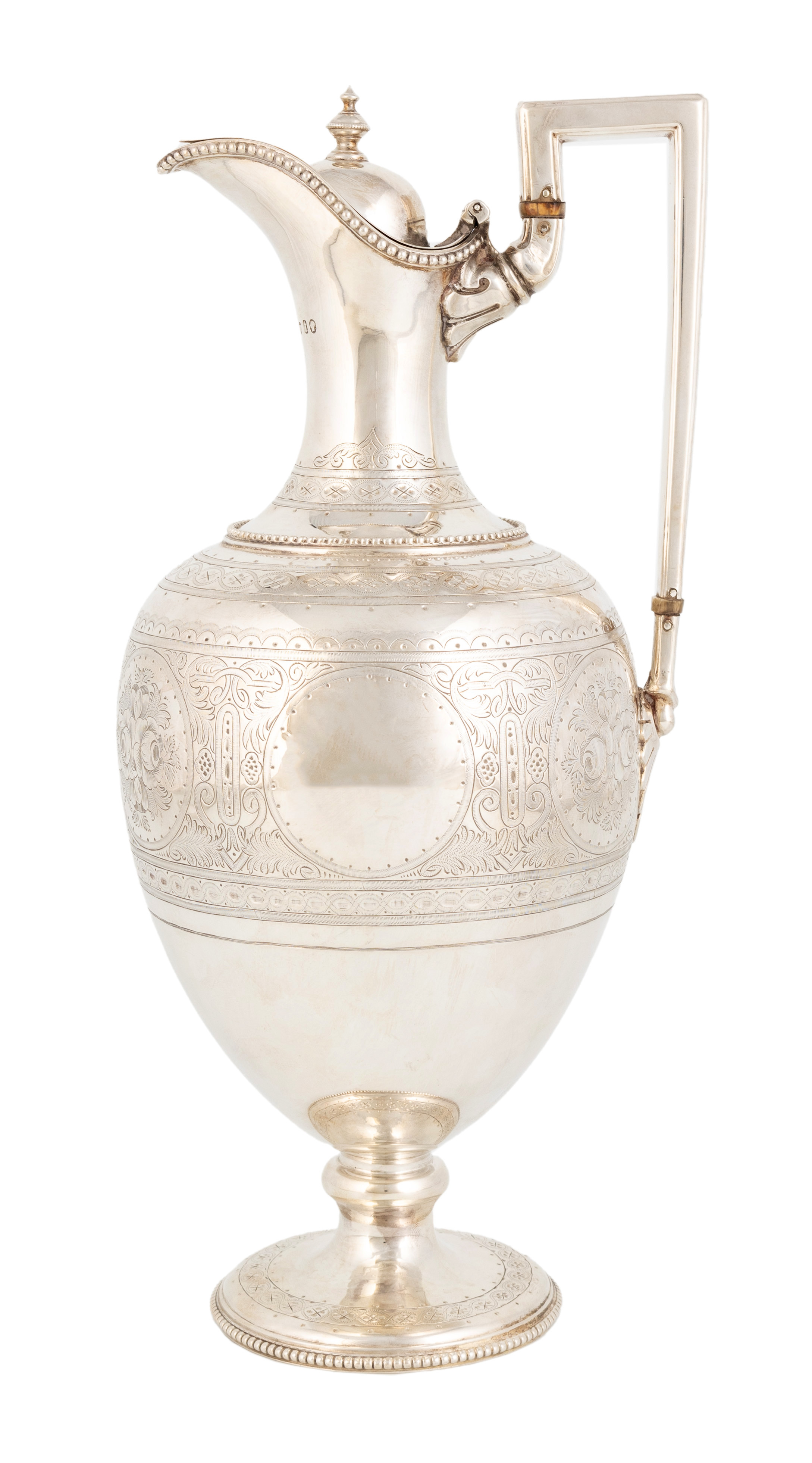 baluster form with beaded borders, engraved with bands of scroll foliate decoration, angular handle with ivory insulators, hinged cover with a knop finial, height 30.2cm, approx. weight 21.6oz.