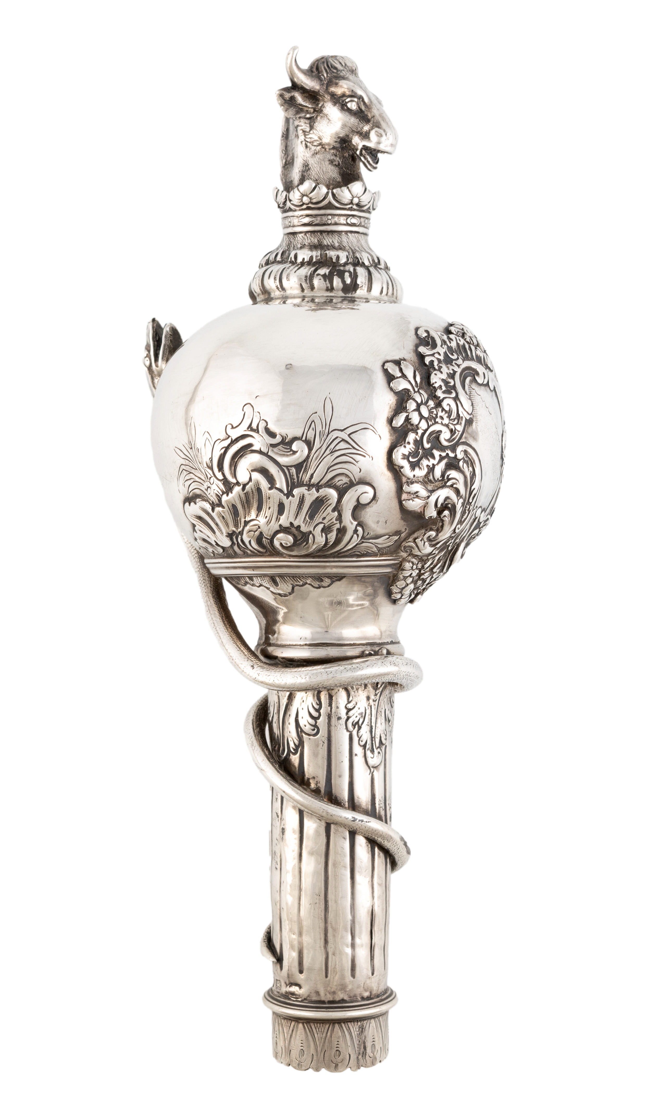 spherical form with shell and scroll decoration and a shell, scroll and foliate applied cartouche, with a crown and bull's head finial, on a fluted column with an applied snake wrapped around, length 29.3cm, approx. weight 22.1oz.