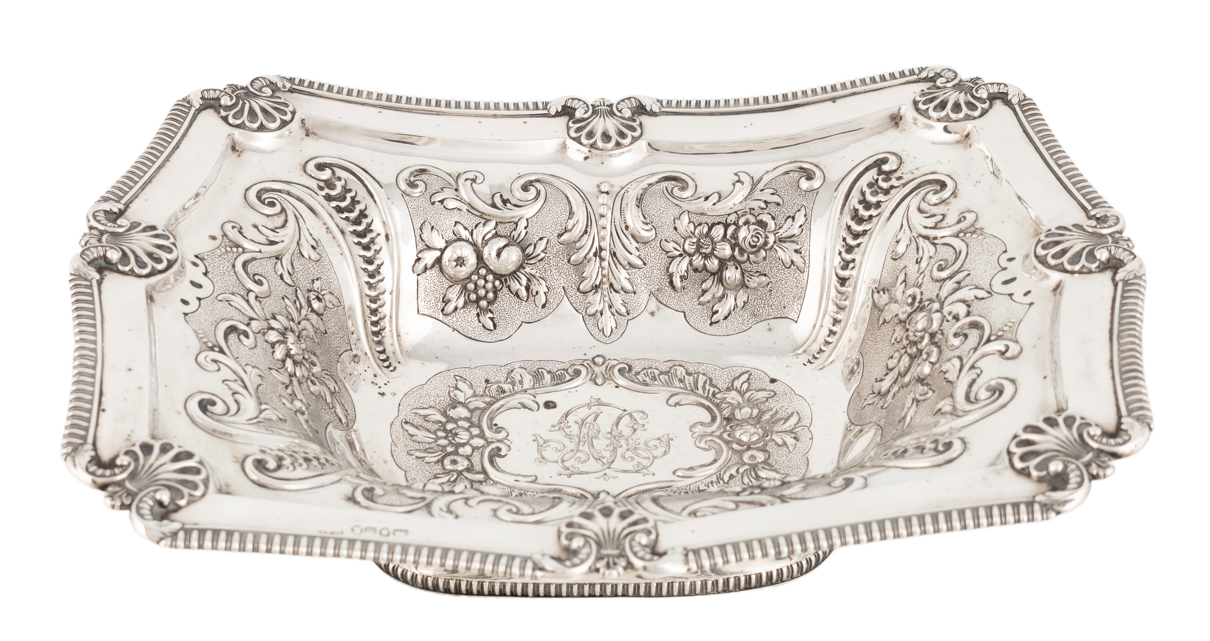 shaped rectangular form, gadroon and shell border, later embossed decoration, the centre with initials, length 33.5cm, approx. weight 29.4oz.