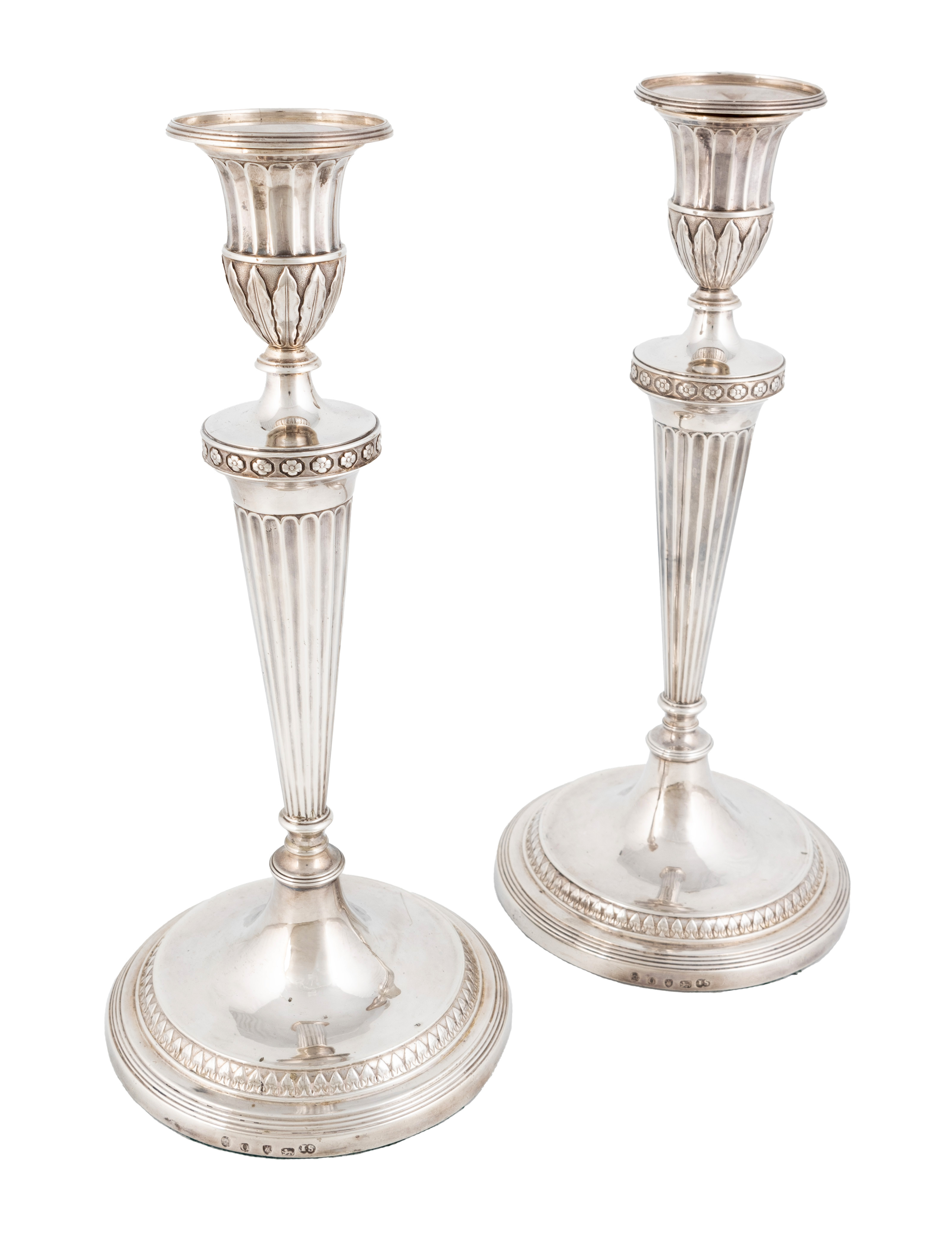 tapering fluted stem, with acanthus leaf flower motif borders, on loaded circular bases, height 31cm. (2)