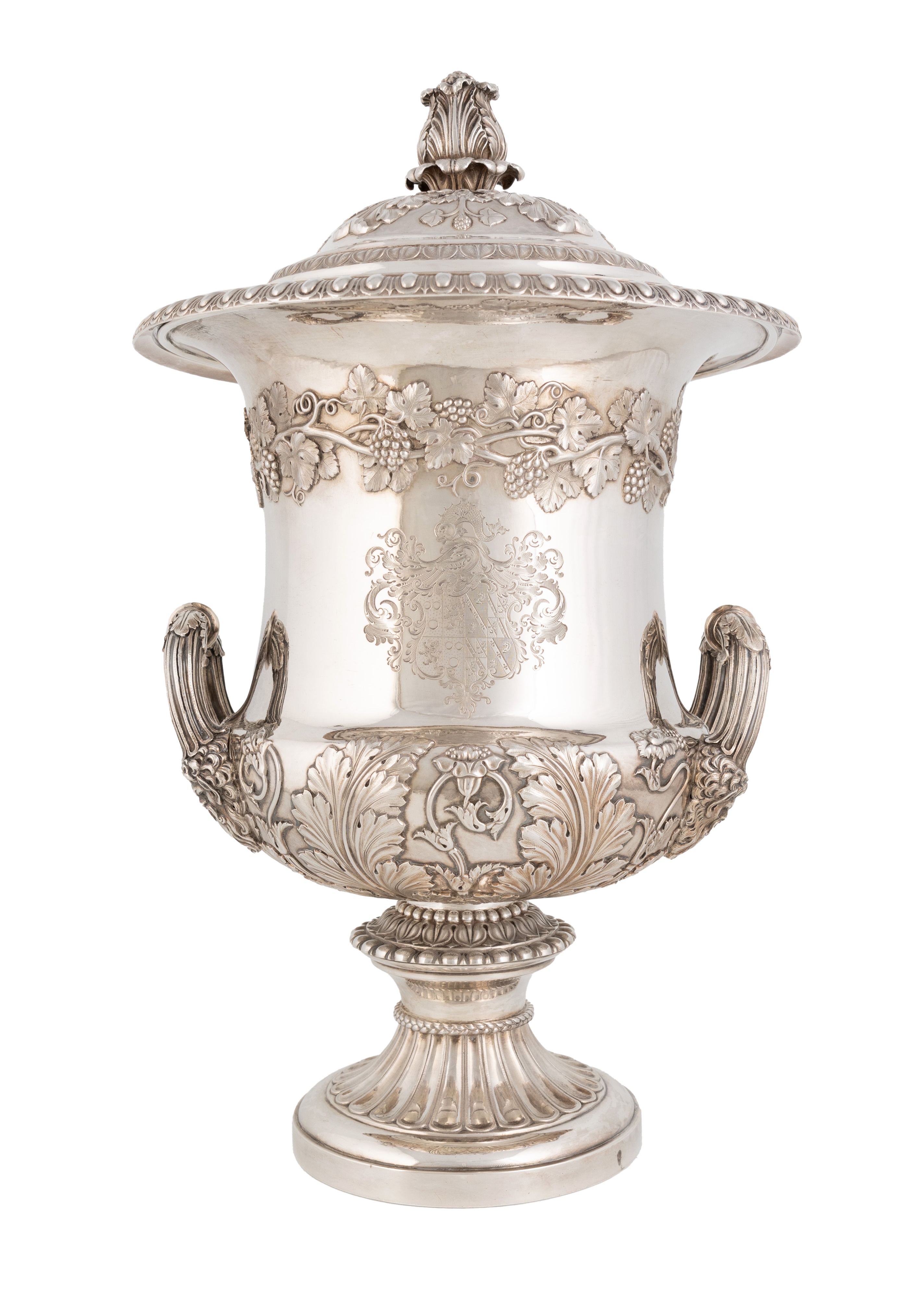 campana form, embossed with trailing grapevines and foliate decoration, the reeded side handles with Bacchus masks, the pull-off cover with a foliate finial, engraved with an armorial and crests, height 41cm, approx. weight 124oz.