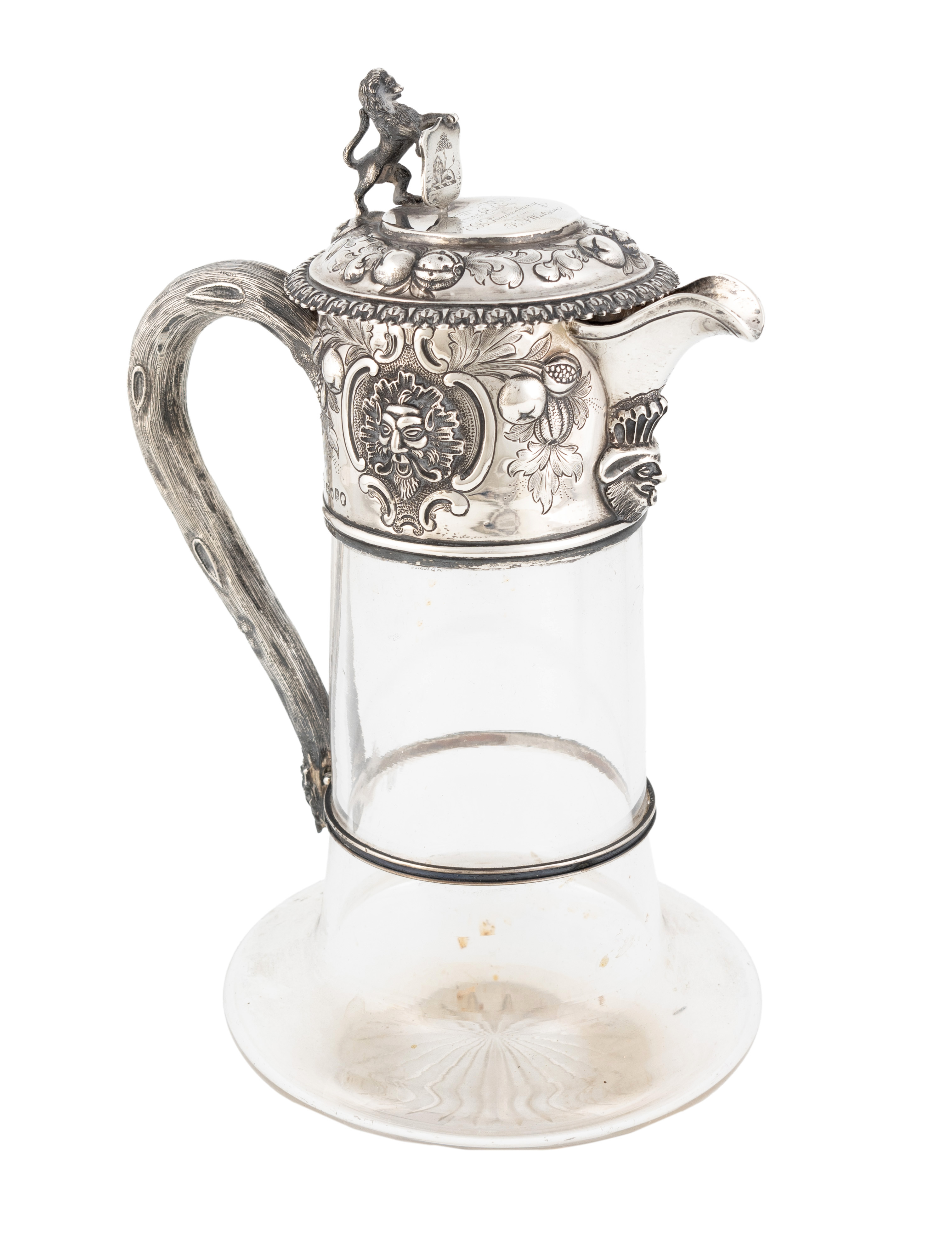 tapering and circular body, the mount with Bacchus masks, foliate scroll decoration, simulated bark scroll handle, the hinged cover with a rampant lion finial holding a crested shield, also inscribed 'Fives Match E. B. Brackenbury V B.F Watson', height 27cm.