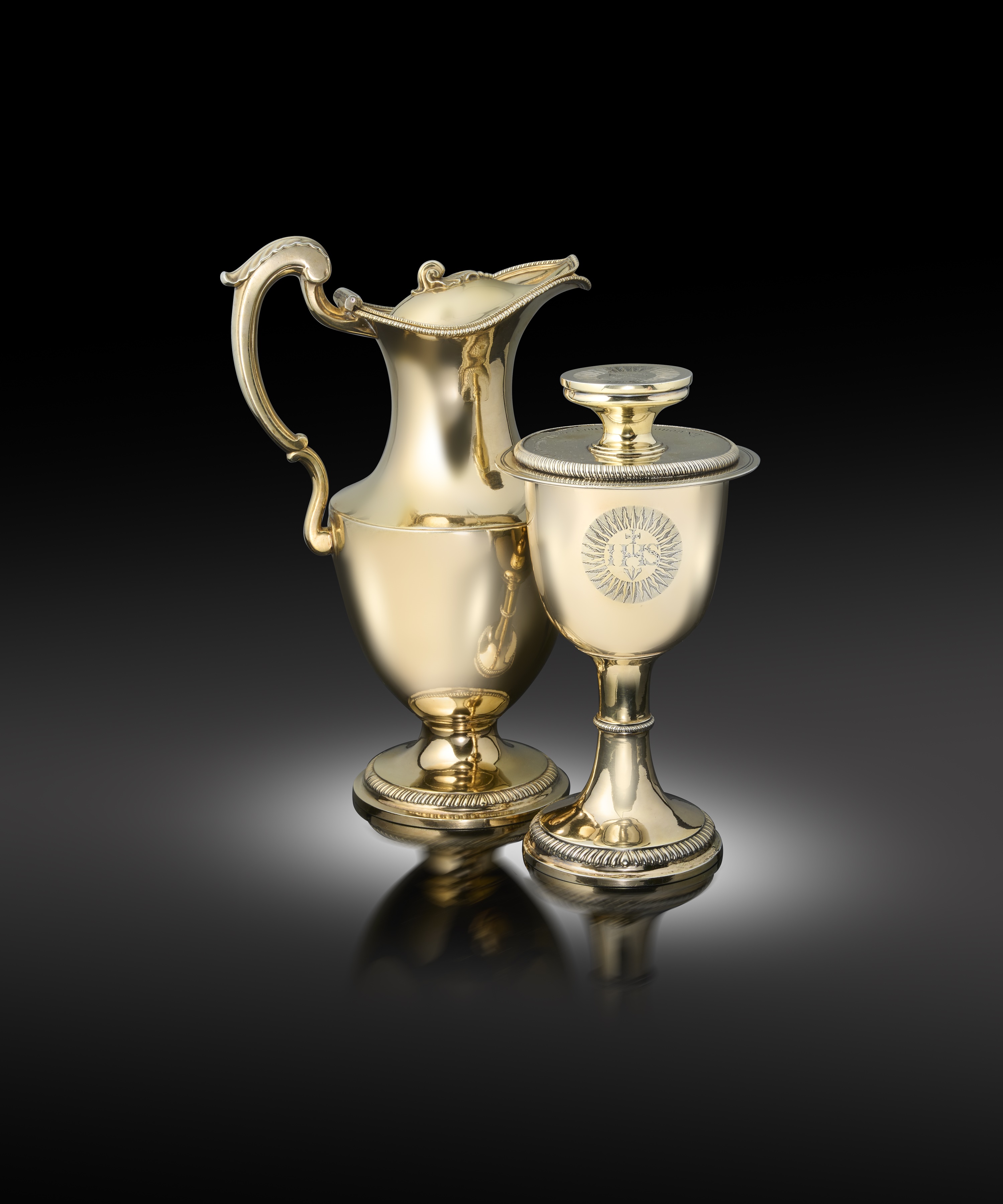 comprising: a ewer, chalice and paten, gadrooned borders, the ewer of baluster form, gadroon borders, all engraved with 'IHS' within a sun and inscribed 'Ex dono Georg Ducis de Marlborough A.D 1773', height of ewer 29cm, height of chalice 20cm, diameter of paten12.3cm, approx. total weight 49oz. (3)