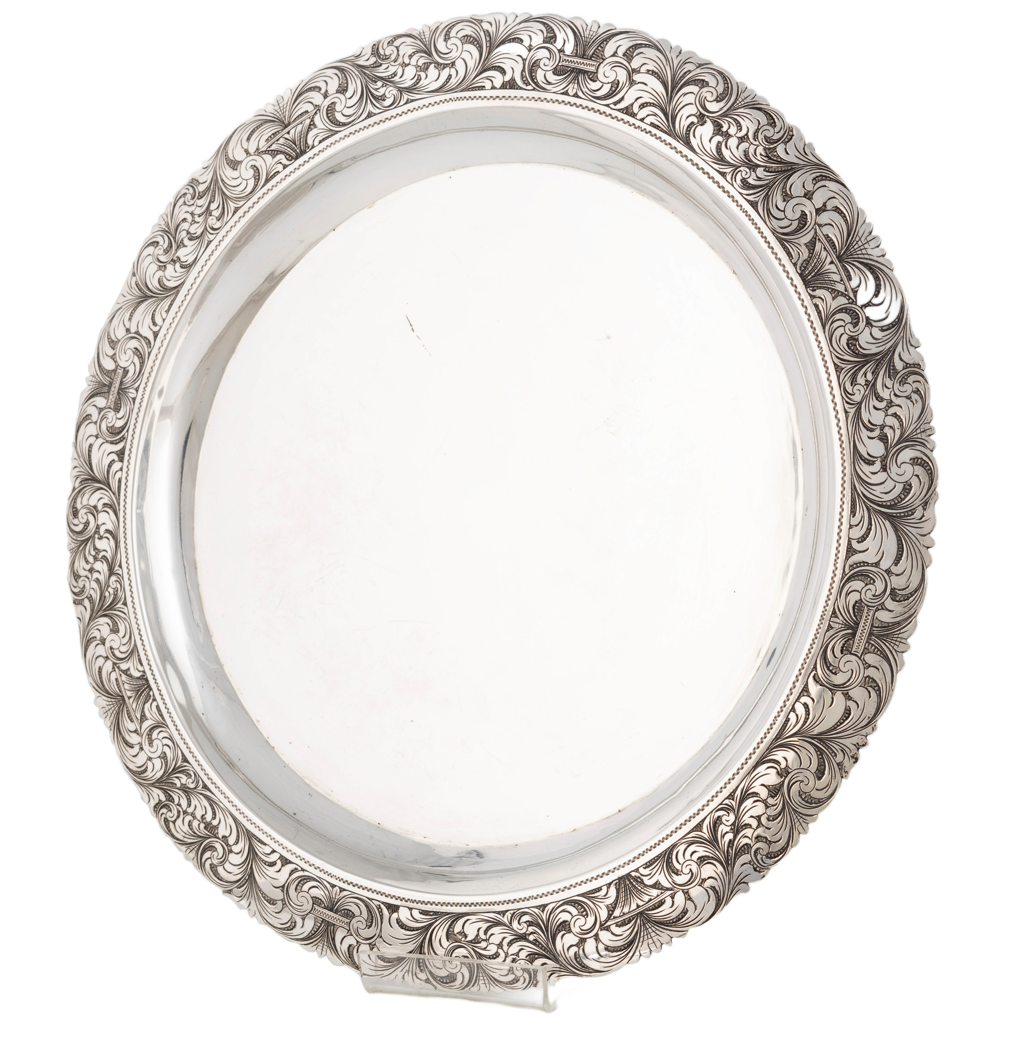 circular form with an engraved chased scroll decoration border, diameter 32cm, approx. weight 14.1oz.