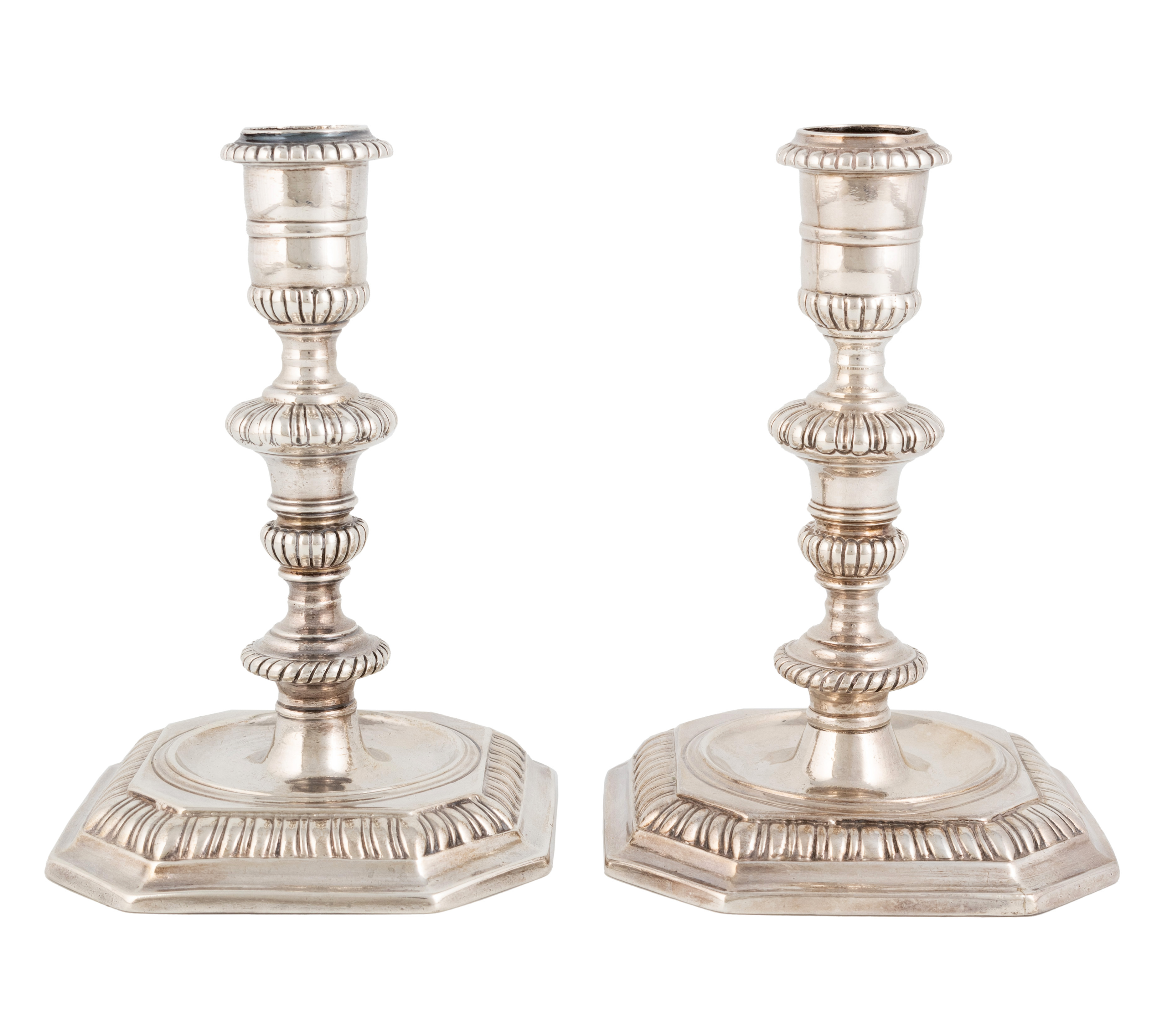 knopped fluted baluster stems, spool-shaped capitals, on raised square bases with canted corners, height 15.5cm, approx. weight 22.2oz. (2)