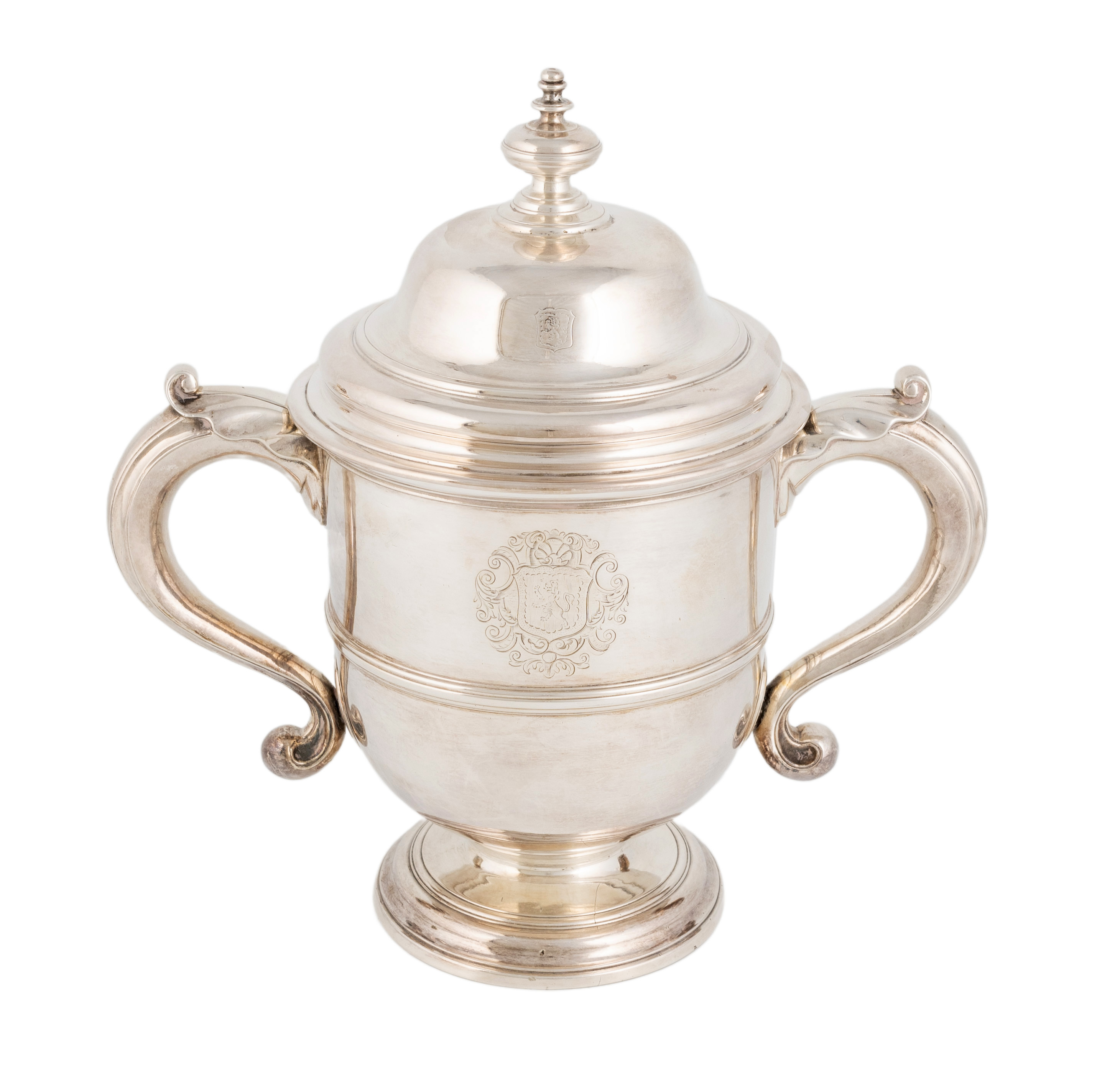circular from, central girdle, leaf capped scroll handles, engraved with a crest within foliate scroll mantling, the pull-off cover with foliate mantling, height 26cm, approx. weight 55.5oz.