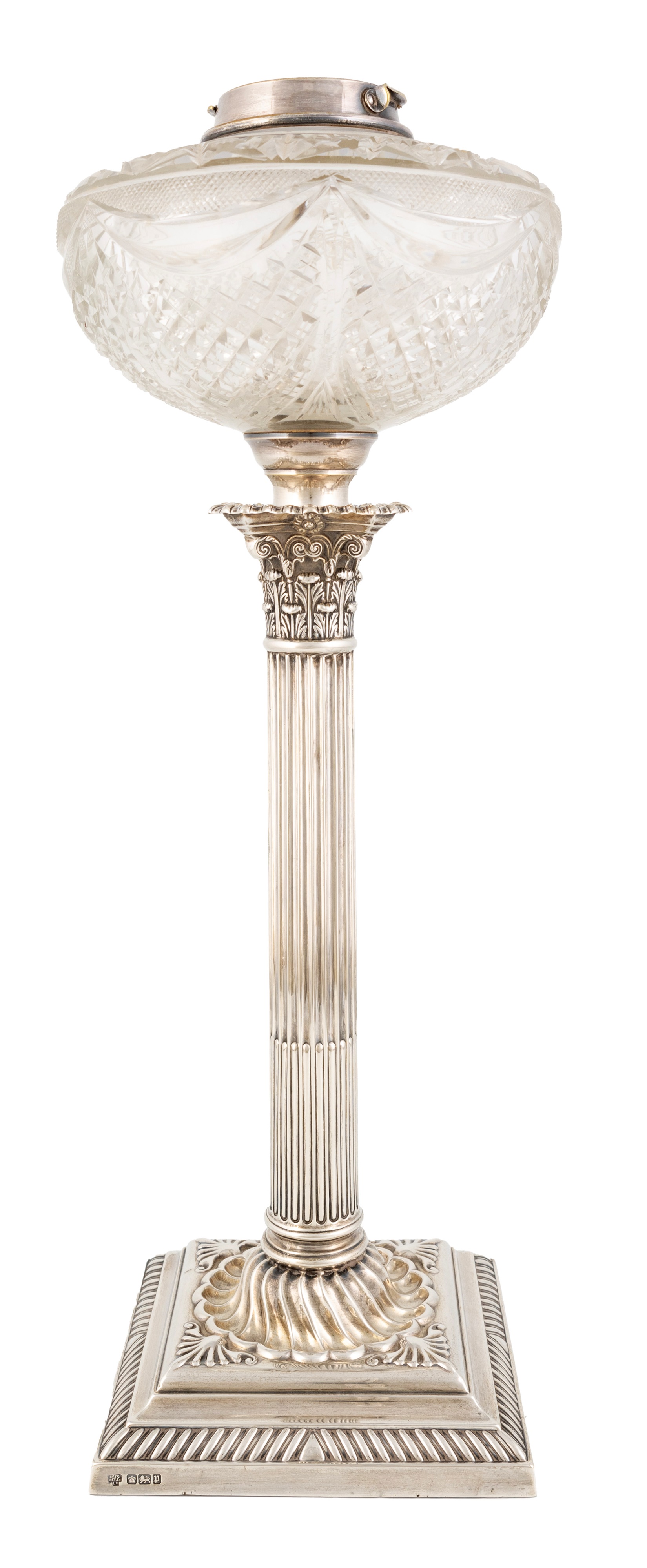 An Edwardian silver Corinthian column oil lamp,