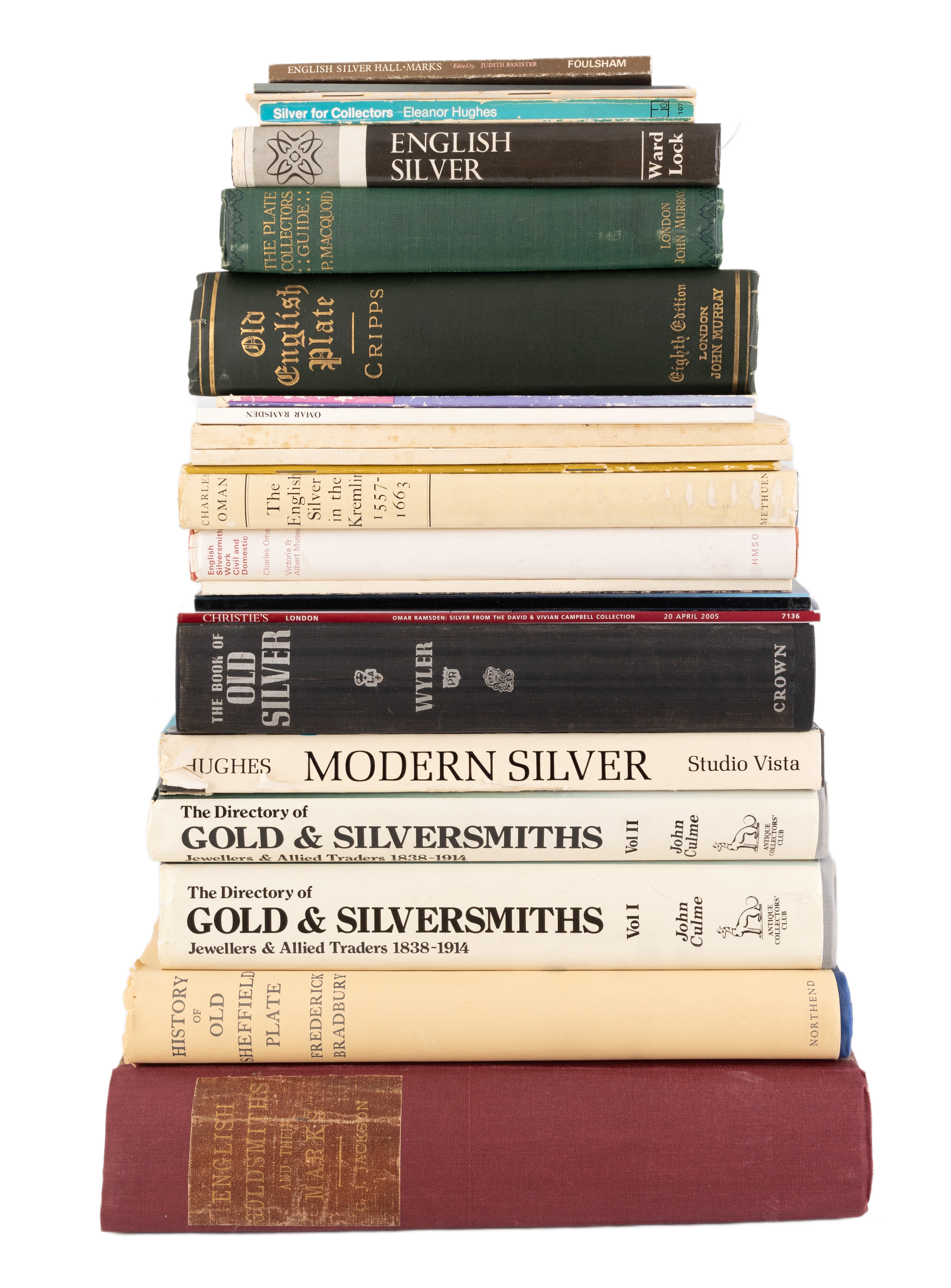 including: Culme, J., The Directory of Gold and Silversmiths, The Antique Collectors Club, 1987, 2 Vols., plus The History of Old Sheffield Plate, Modern Silver, English Goldsmiths and Their Marks, by Jackson, English Silver in the Kremlin and other volumes. (qty)