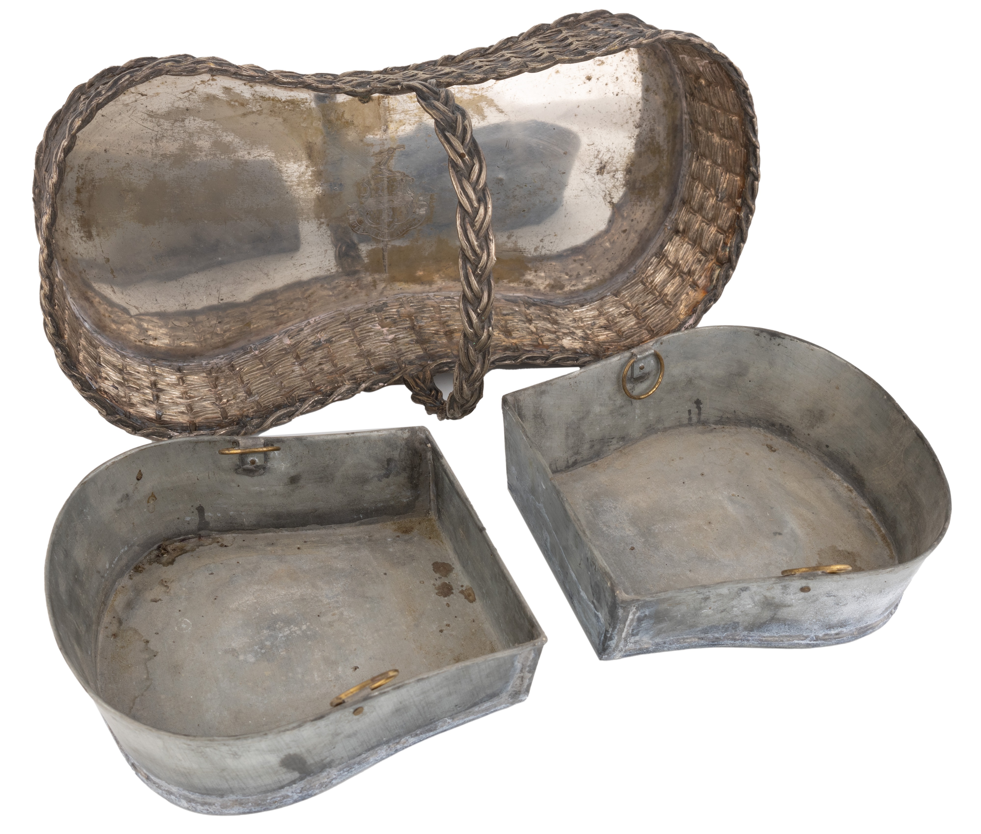 shaped oval form with weaved decoration, engraved with an armorial, with two pull-out liners, length 42.5cm.