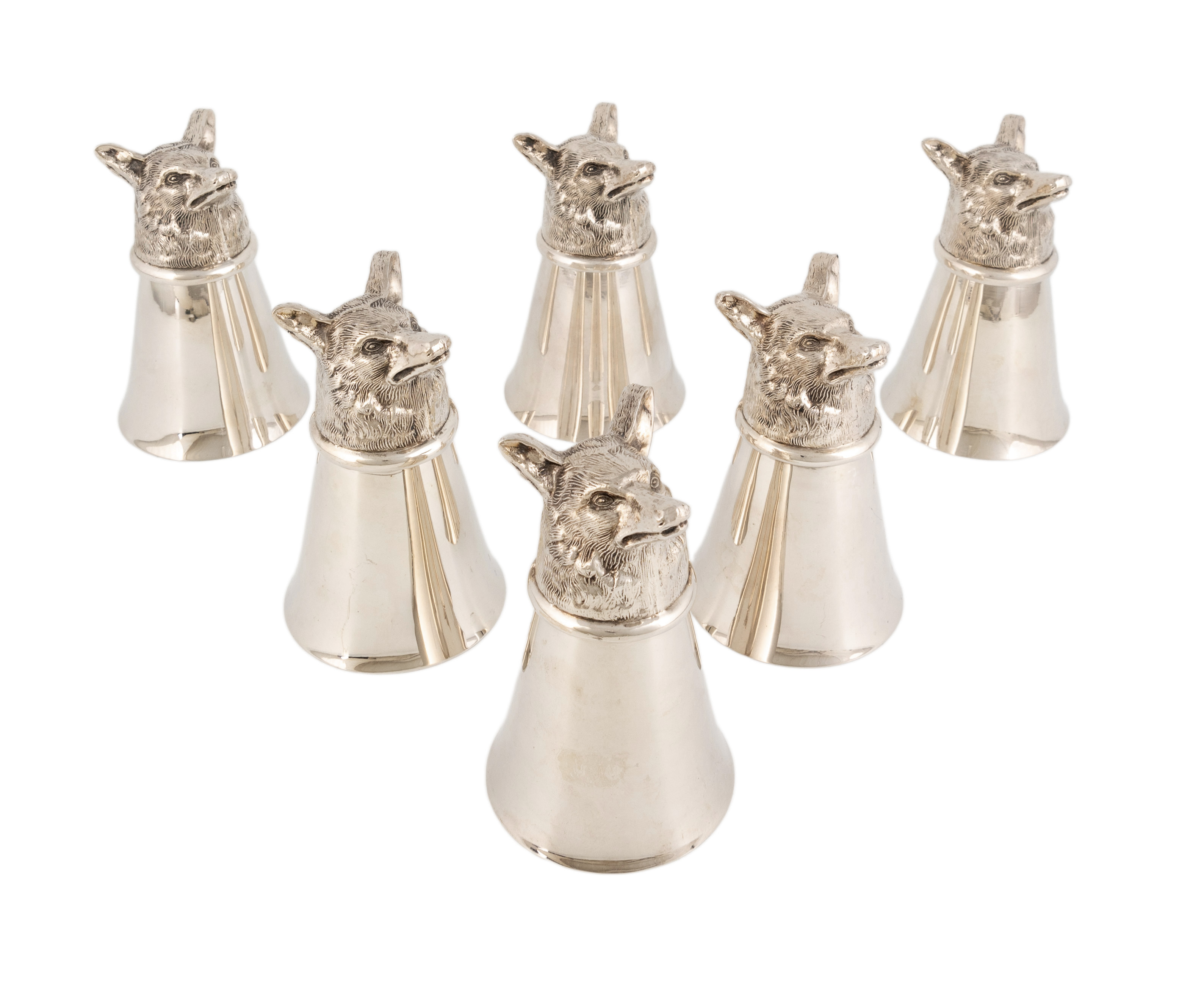 A set of six American electroplated fox head stirrup cups,