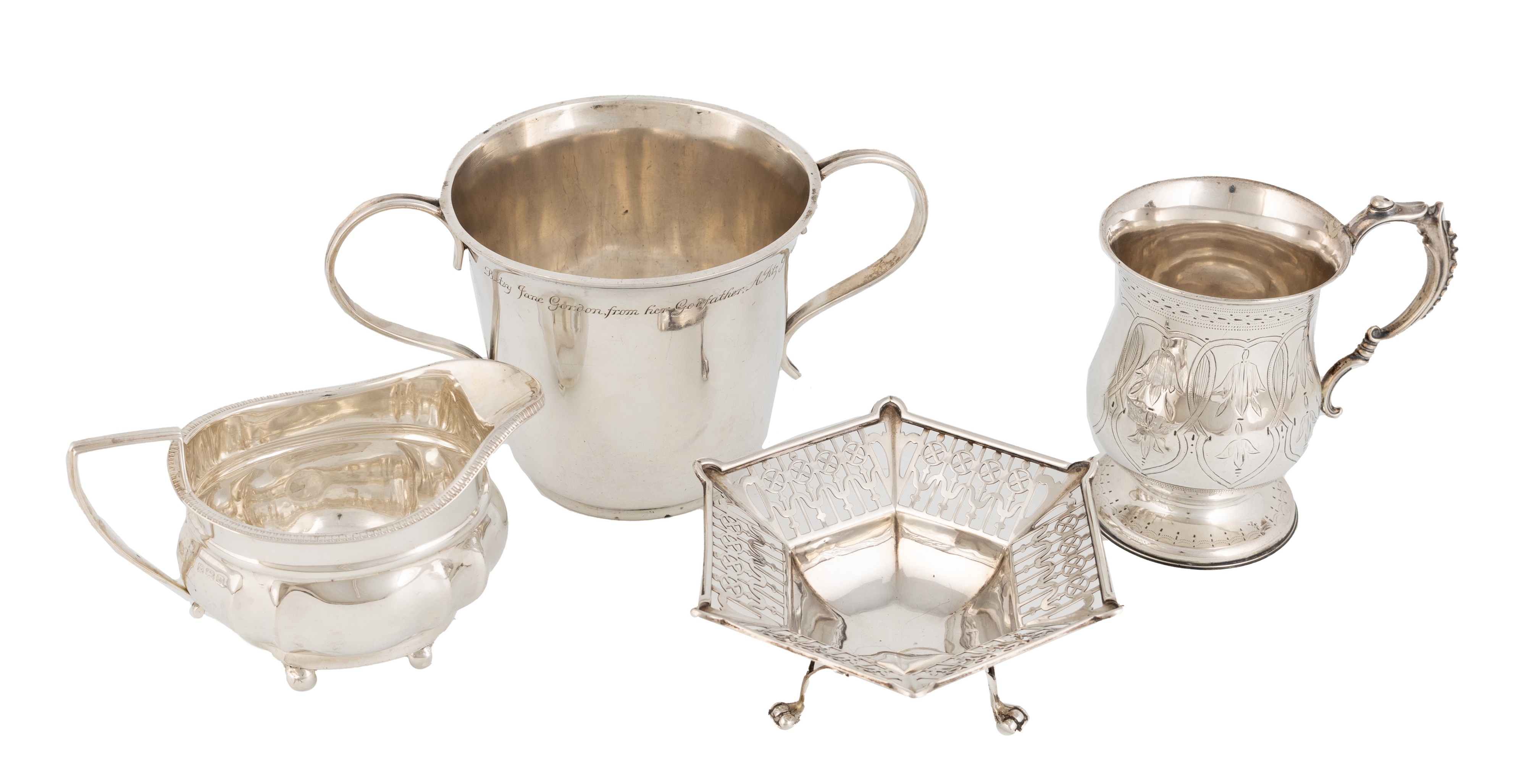 comprising: a two-handled porringer, by A and F Parsons, (Tessiers), London 1910, a Victorian mug, by Hilliard and Thomason, Birmingham 1868, a cream jug and a pierced bonbon basket, on three scroll legs, approx. total weight 20oz. (4)