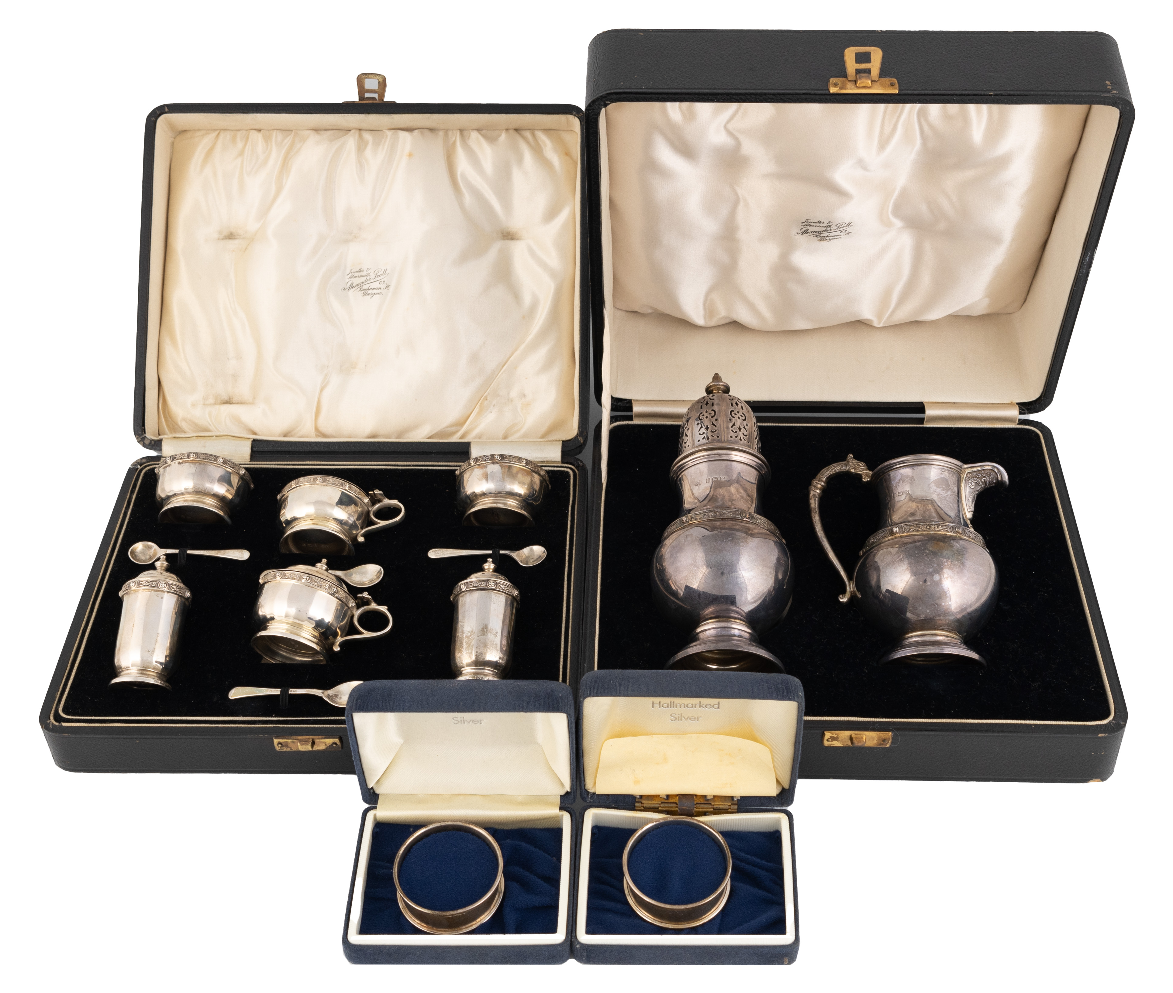 faceted circular form with a Celtic border, comprising: two mustard pots, two salt cellars, two pepper pots, two salt and two mustard spoons, plus a cased silver caster and cream jug, and two cased silver napkin rings, total approx. weight 16.7oz. (qty)