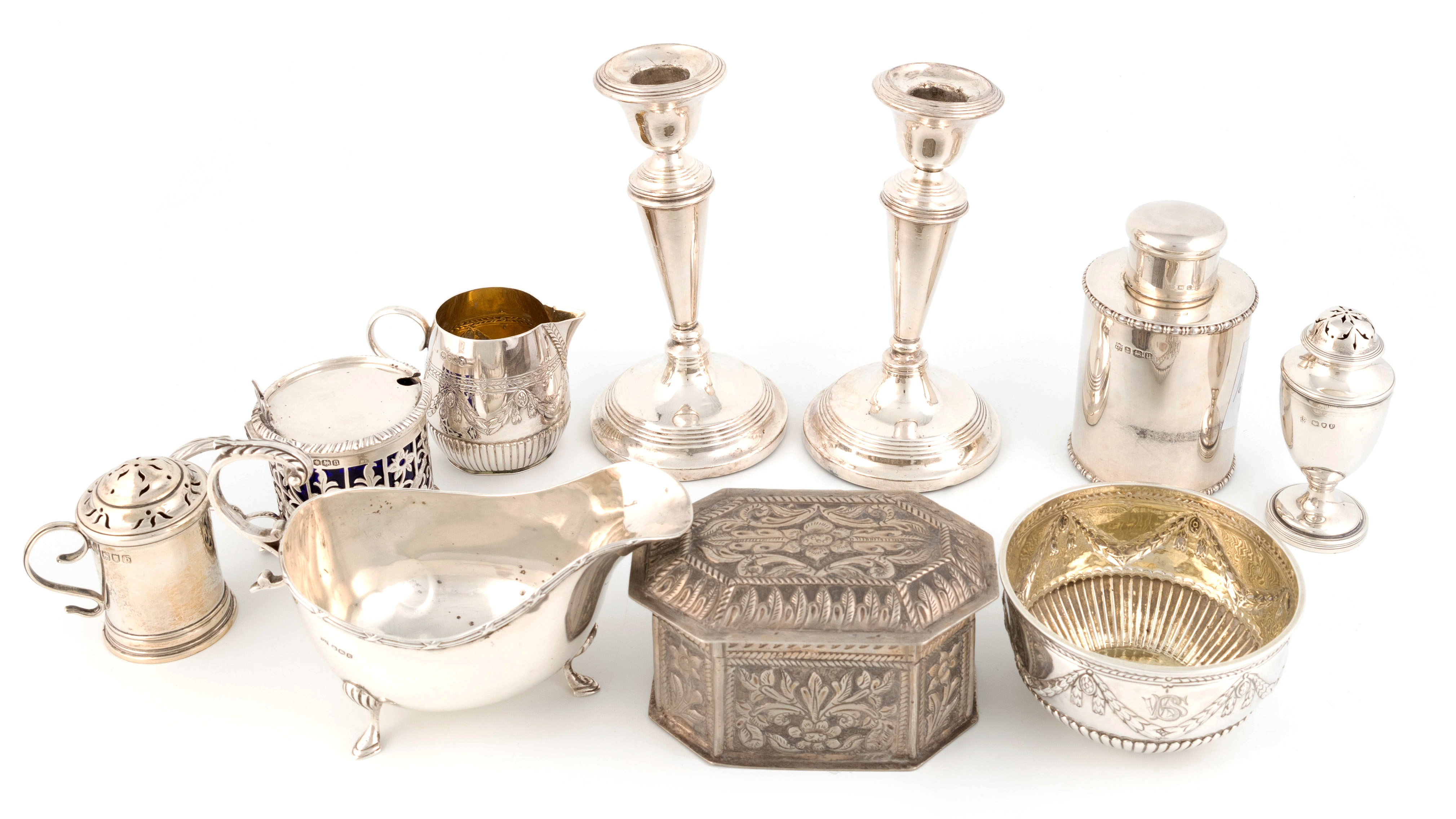 comprising: a matched Victorian silver cream jug and sugar bowl by Henry Holland, London 1878, a tea caddy, a pepperette, a sugar caster, a sauce boat, a mustard pot and a pair of candlesticks, plus a metalware tea caddy, total approx. weighable 22.1oz. (10)