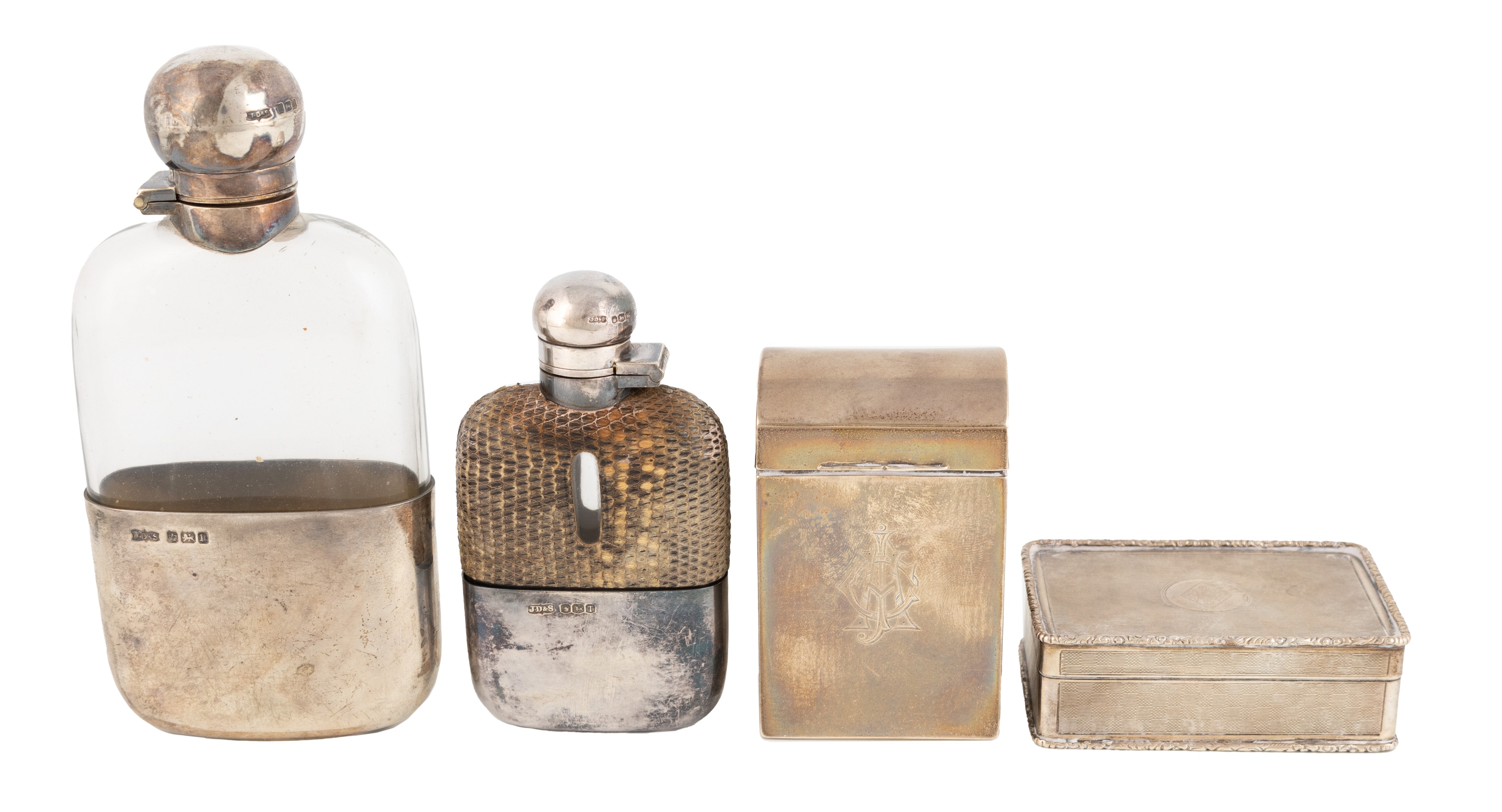 rectangular form with a domed cover, engraved with a monogram, height 8.2cm, plus a silver dice box by A Wilcox, Birmingham 1932 and two silver-mounted glass hipflasks, total approx. weighable 8.9oz. (4)