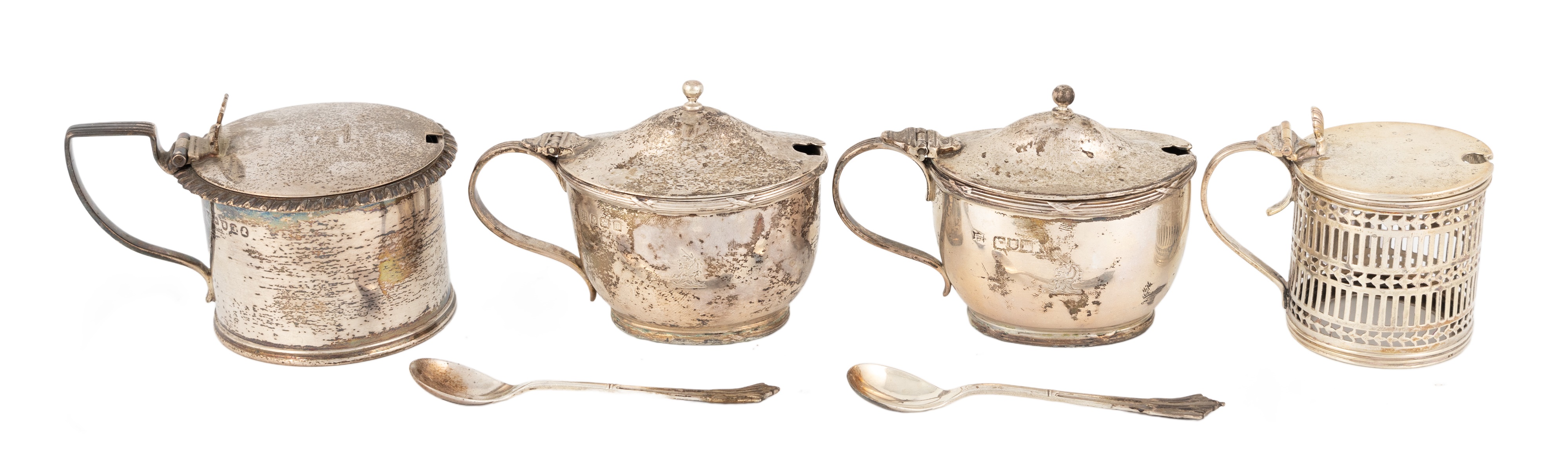 plain circular form with gadrooned border, length 10cm, plus a pair of mustard pots by S W Smith & Co, London 1907 (a.f), a mustard pot by D & J Wellby Ltd, London 1913, plus a pair of mustard spoons, total approx. weight 12.7oz. (6)