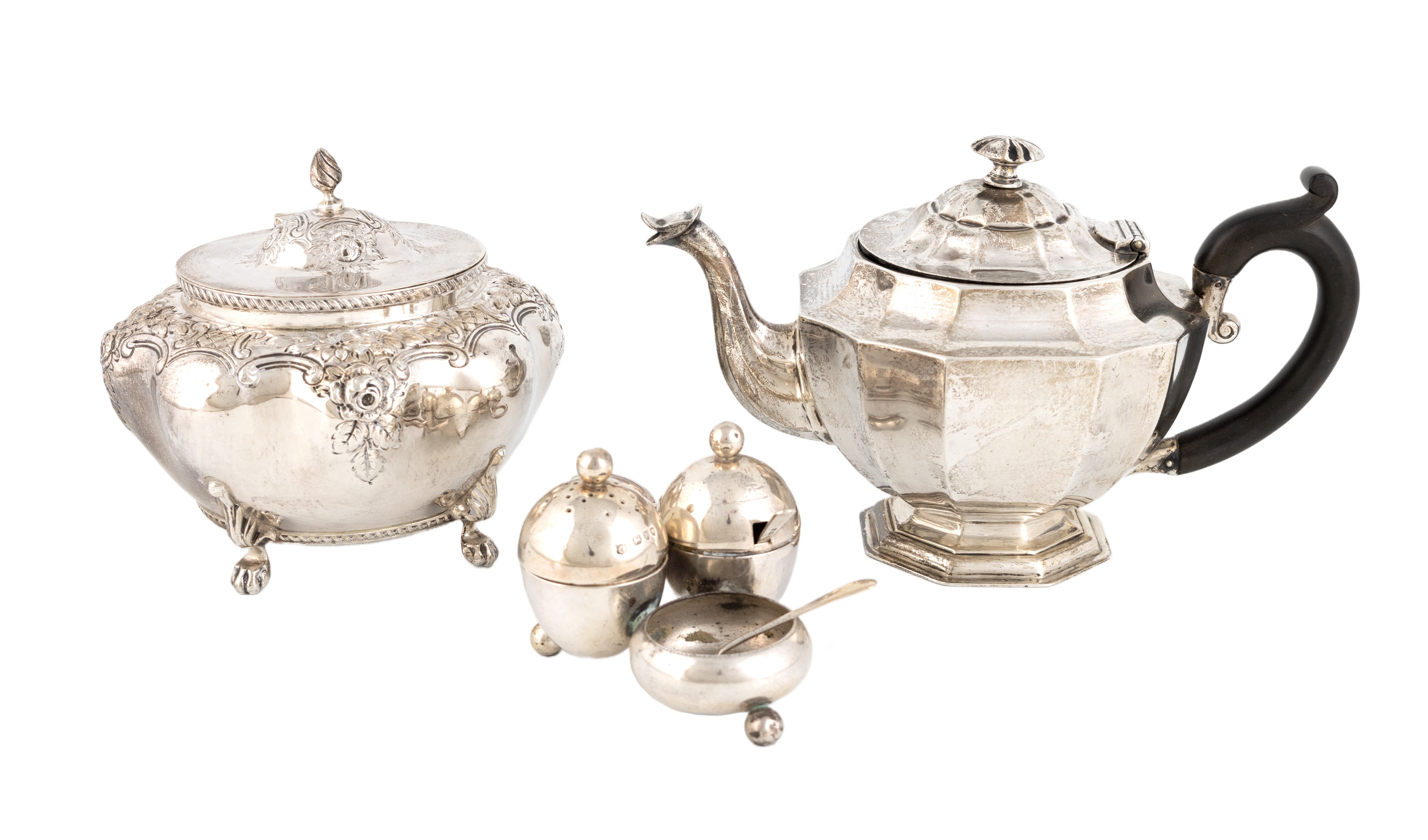 comprising: a late-Victorian tea caddy, by Thomas Hayes, Birmingham 1898, lobed bombé form, foliate scroll decoration, plus a small teapot, Birmingham 1899 and a three-section cruet frame, London 1894, with a later spoon, total approx. weight 25oz. (3)