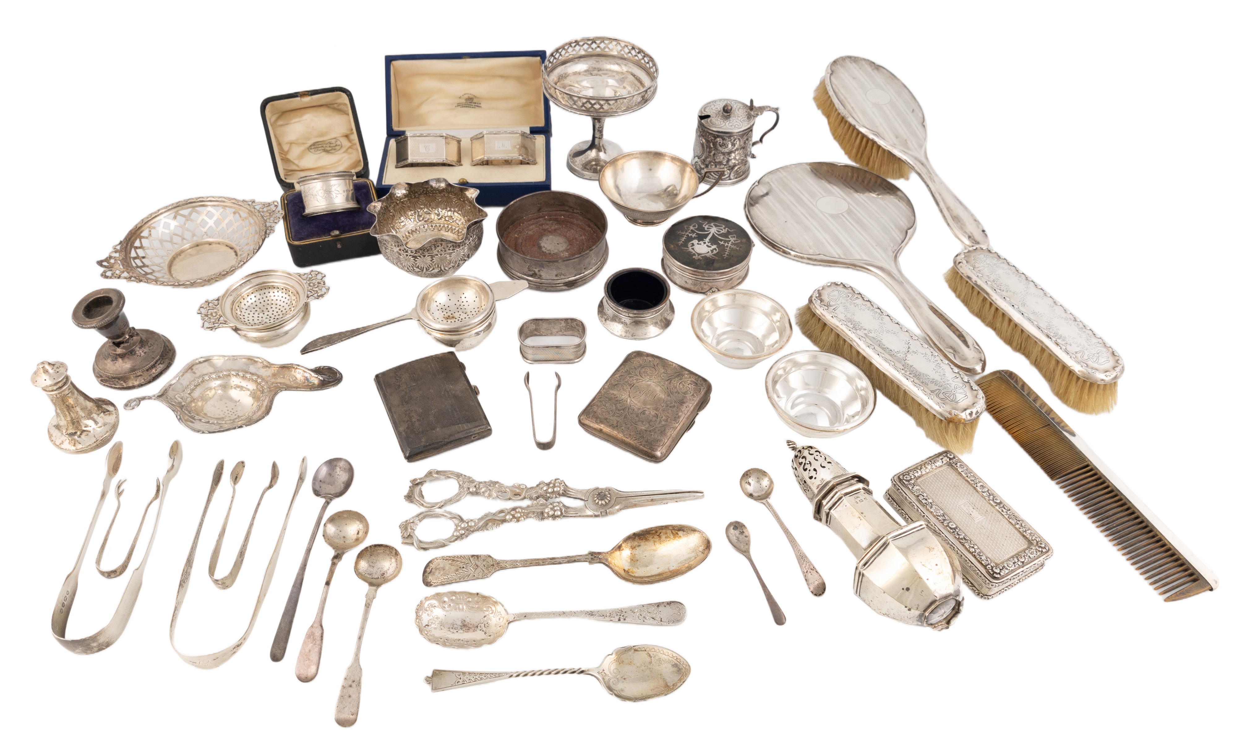 various dates and makers, comprising: a pair of Victorian grape scissors, a snuff box, London 1924, a French cup, a small coaster, two cigarette cases, a bonbon dish, three tea strainers, a mustard pot, a caster, (foot a.f), four napkin rings, a tazza, an Indian bowl, a dressing table box, two small bowls, and other items including flatware, approx. weight 46oz. (qty)