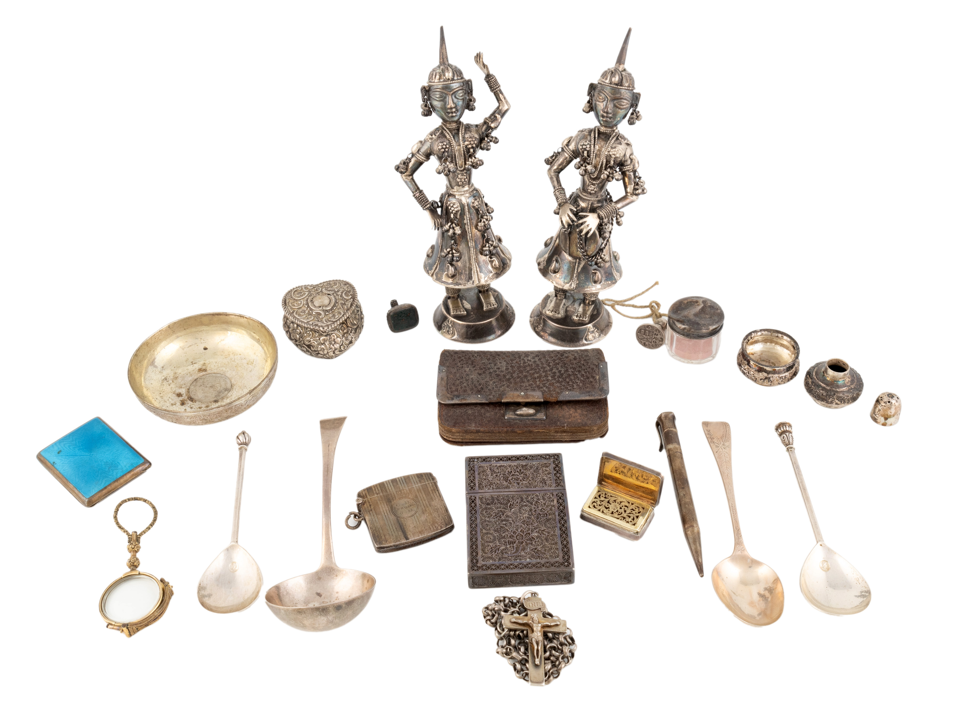 comprising: a vinaigrette, Birmingham 1838, a silver and enamel match box cover, a vesta case, a filigree card case, two fob seals, a crucifix, a sauce ladle, three spoons, a heart shaped box, a silver-mounted leather purse, two Far Eastern figures of dancers, a dish, a salt and pepper, a toilet jar and pair of gilt metal lorgnettes, approx. weighable 10oz. (qty)