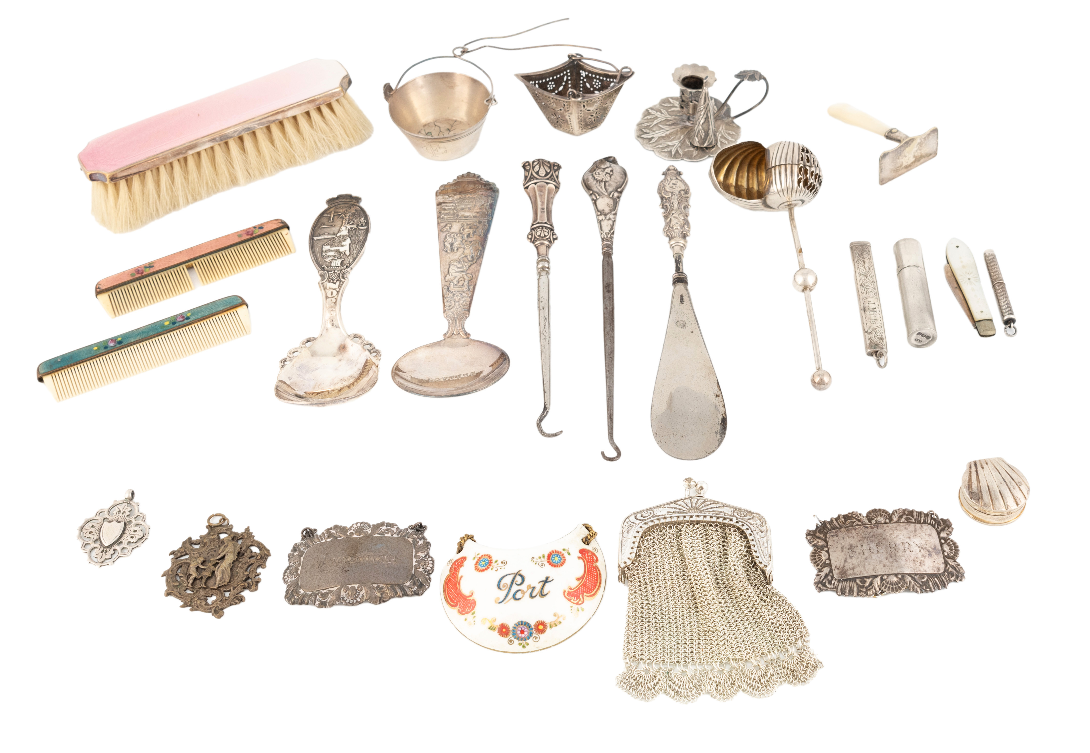 comprising: a Victorian miniature leaf chamberstick, by Joseph Willmore, Birmingham 1841, a shell sifting spoon, two wine labels, a needle case, a tooth pick, a box, two button hooks, a shoe horn, a fruit knife, plus other items and electroplated items, approx. weighable 3.8oz. (qty)
