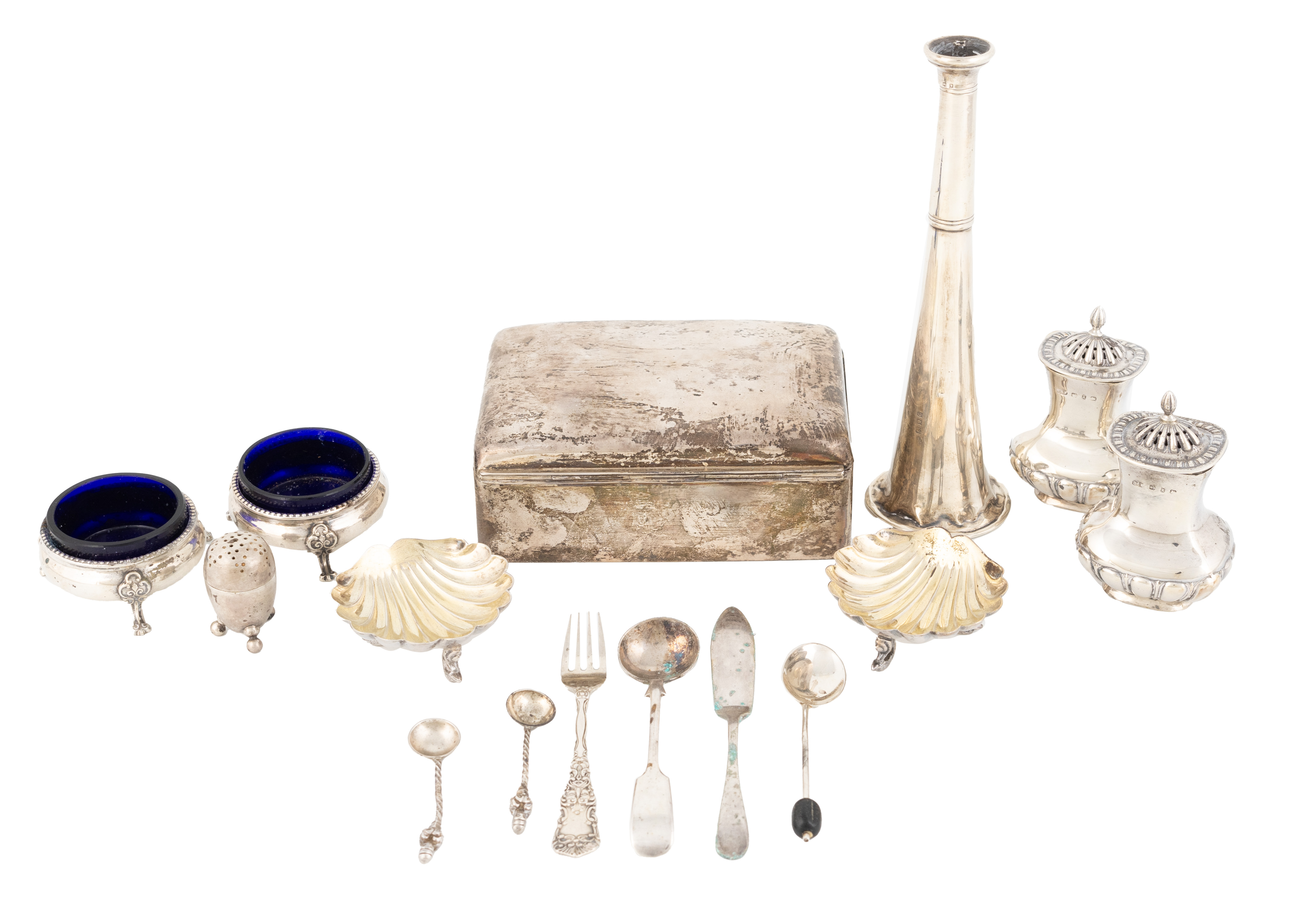 comprising: a cigarette box, marks partially worn, Birmingham 1919, the hinged cover with initials, the front inscribed 'Gunroom Mess, H.M.S.Hood, 27.12.21', plus a table cigar lighter modelled as a hunting horn, by The Goldsmiths and Silversmiths Company, London 1918, a pair of shell salt cellars, a pair of cauldron salt cellars, a pair of pepper pots, a fork and various spoons, approx. weighable 12.5oz. (qty)