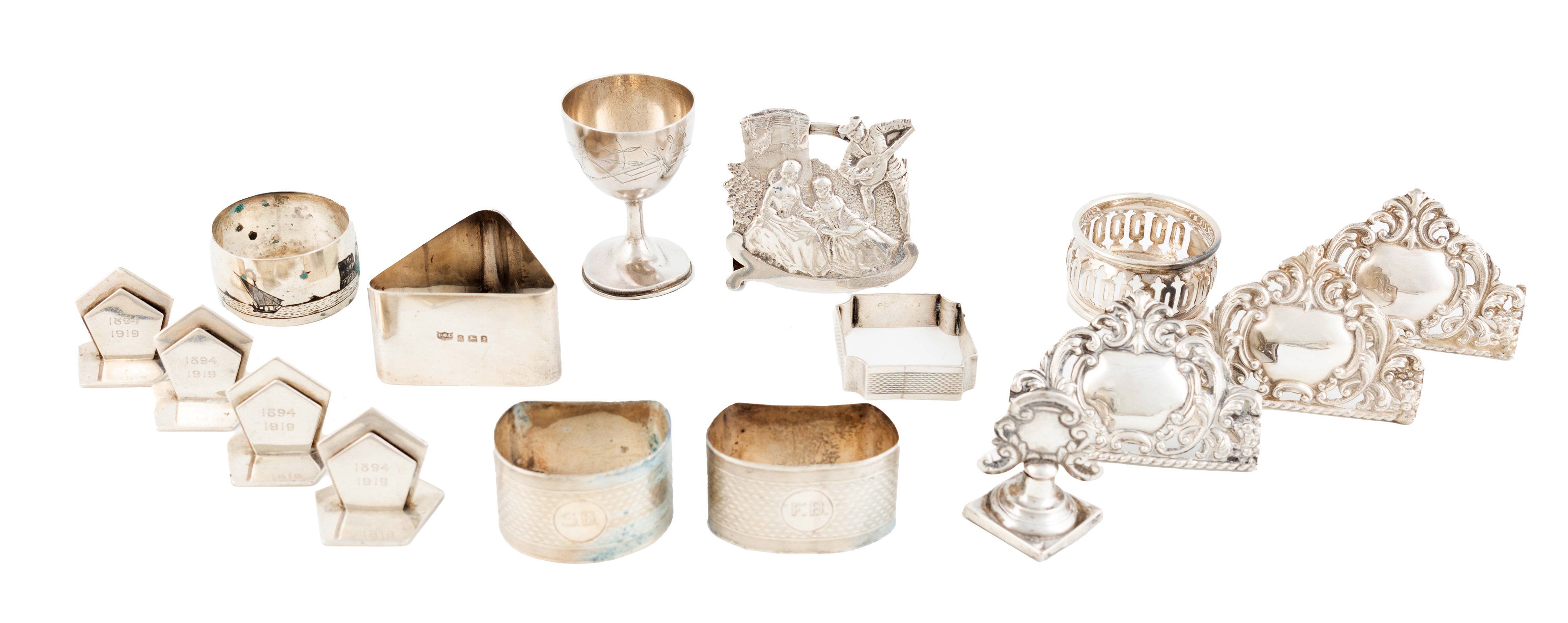 comprising: a set of four silver menu card holders by Asprey & Co Ltd, London 1913, plus five other menu card holders, an Iraqi silver and niello napkin ring and five other napkin rings and a small cup, total approx. weighable 11.6oz. (16)