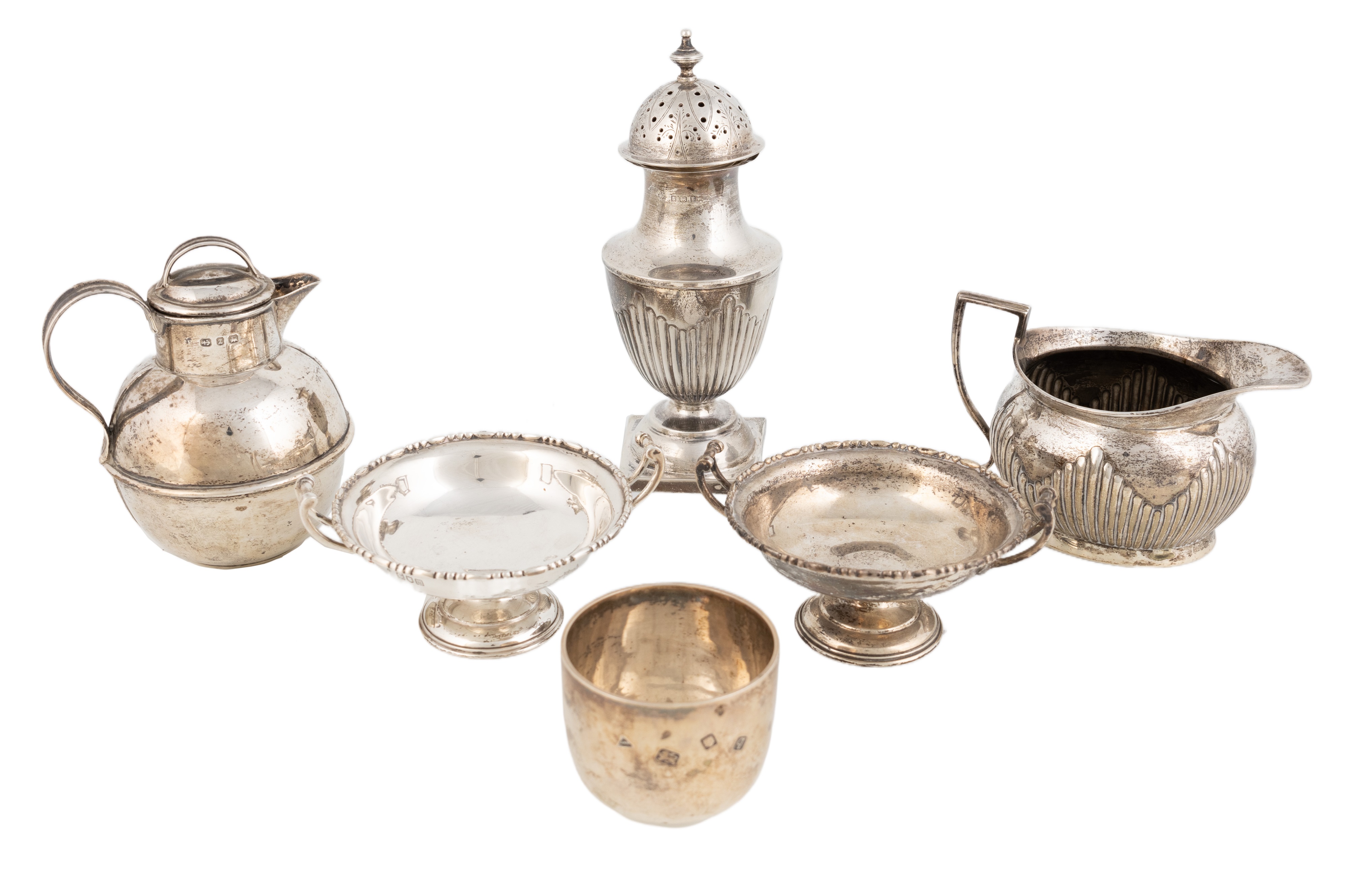 comprising: a Guernsey milk can, Birmingham 1899, a sugar caster, a modern tumbler cup, a cream jug, and a pair of bonbon dishes, approx. weight 23oz. (6)