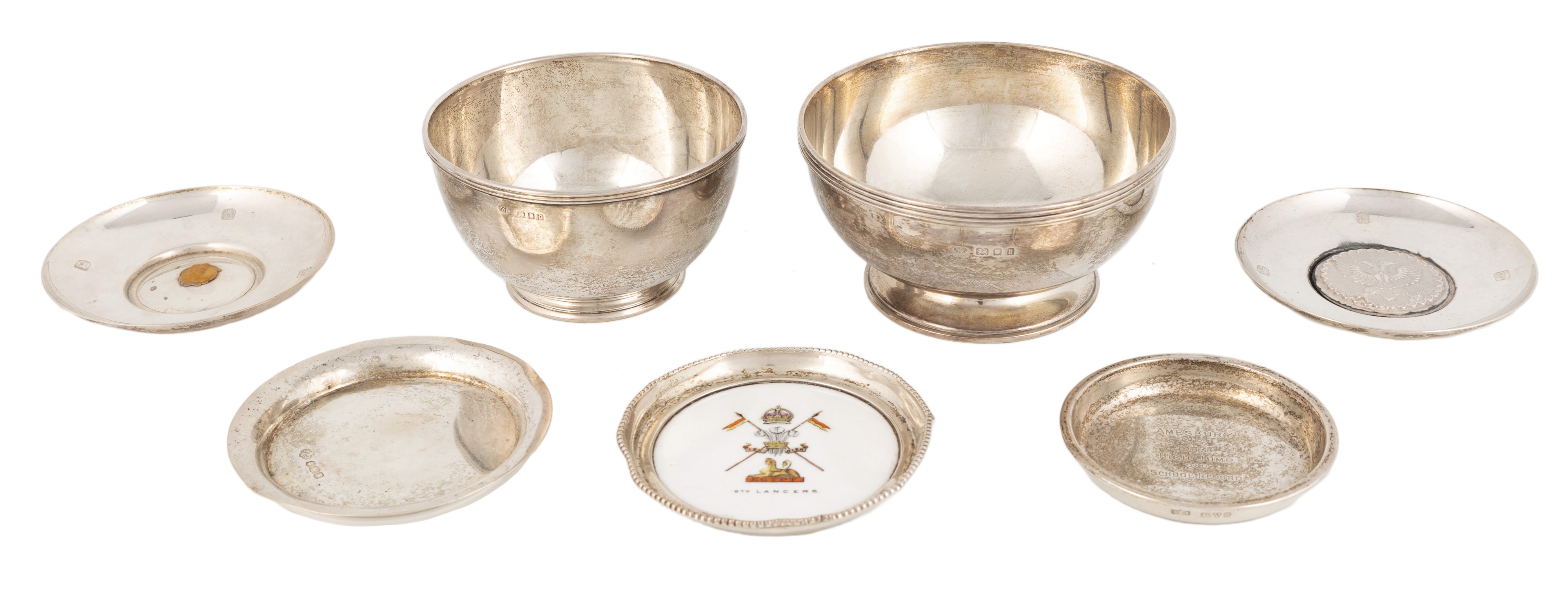 comprising: a sugar bowl by Goldsmiths & Silversmiths Co., London 1925, plus another sugar bowl, four dishes and a silver-mounted ceramic dish, total approx. weighable 16.3oz. (7)