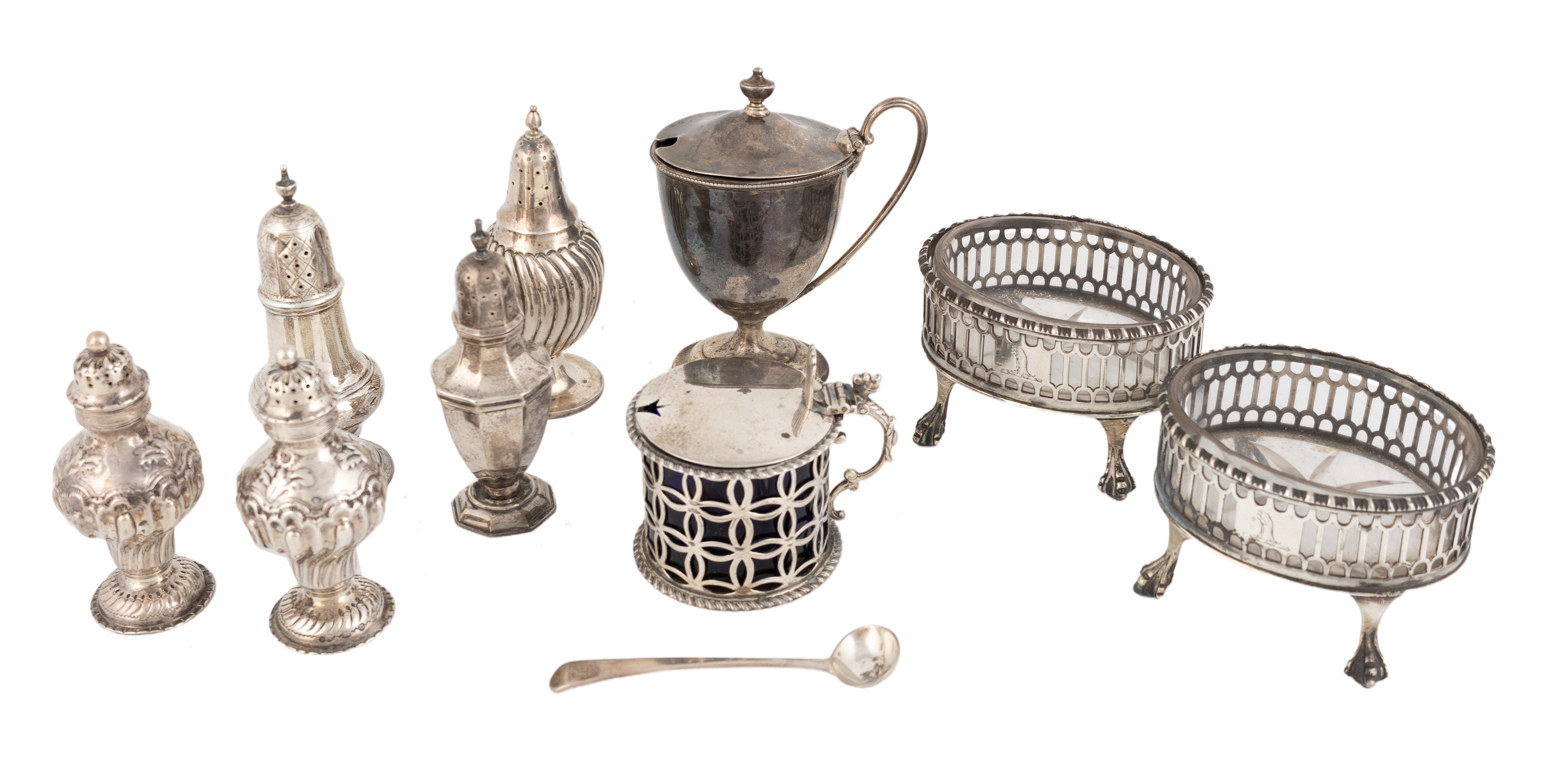 A collection of silver condiments,