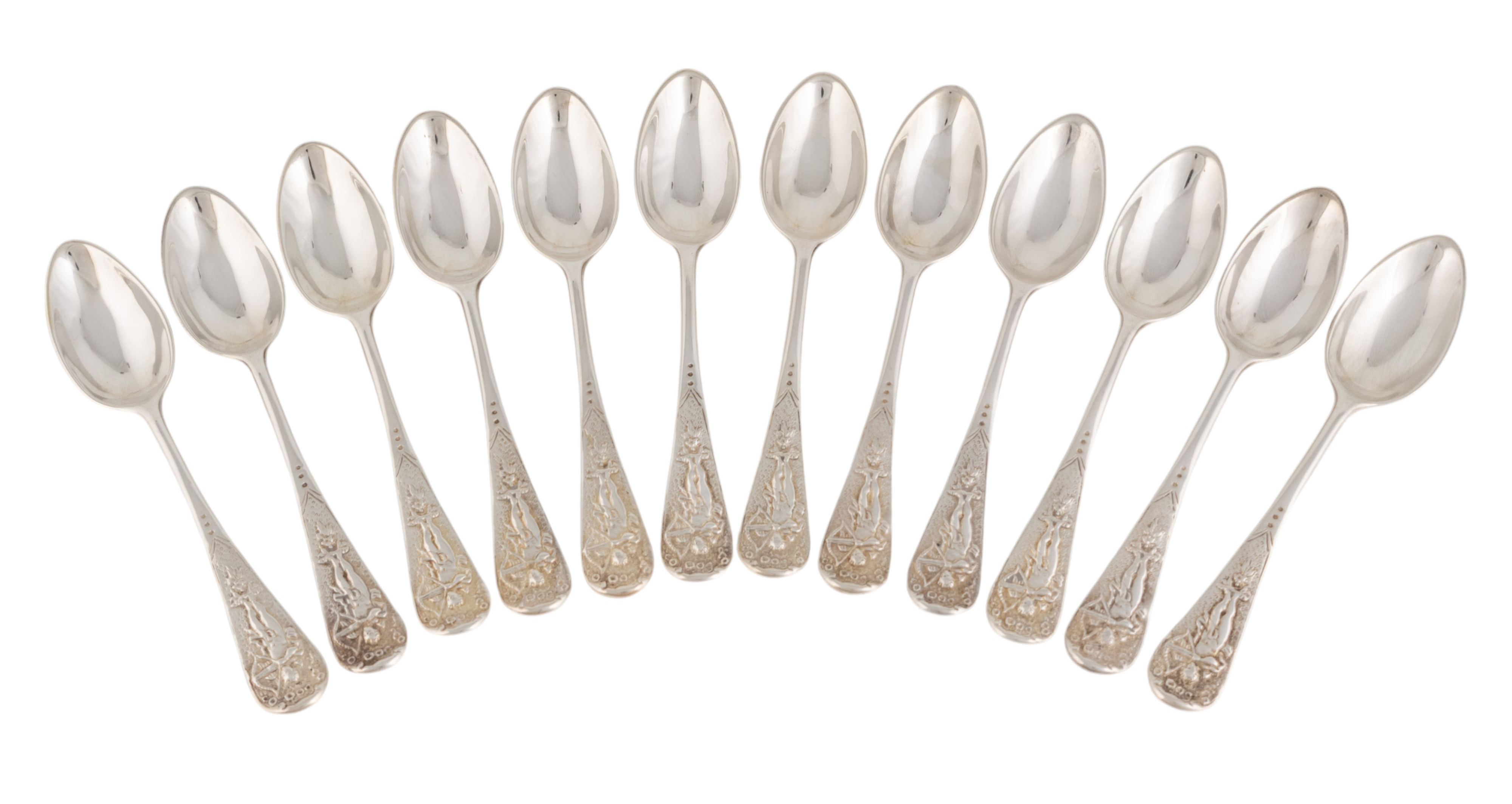 the terminals with Cupid firing an arrow, with scroll decoration to the reverse of the bowl, and engraved crests to the underside of the terminals, length 11.6cm, total approx. weight 5.8oz.