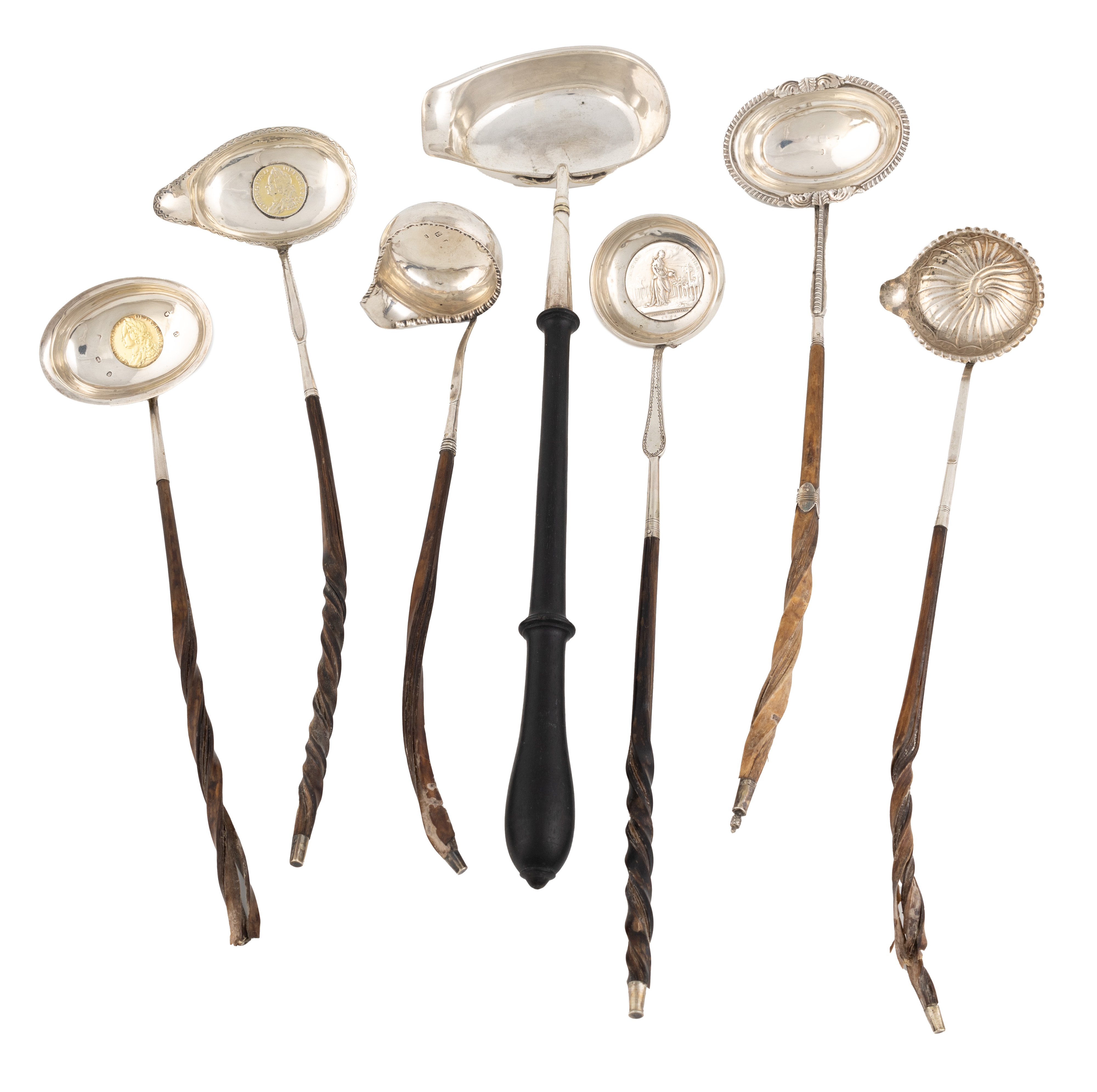 comprising: six silver ones, late -18th/early-19th century, twisted whalebone handles, three set with coins, plus an electroplated toddy ladle, wooden baluster handle. (7)