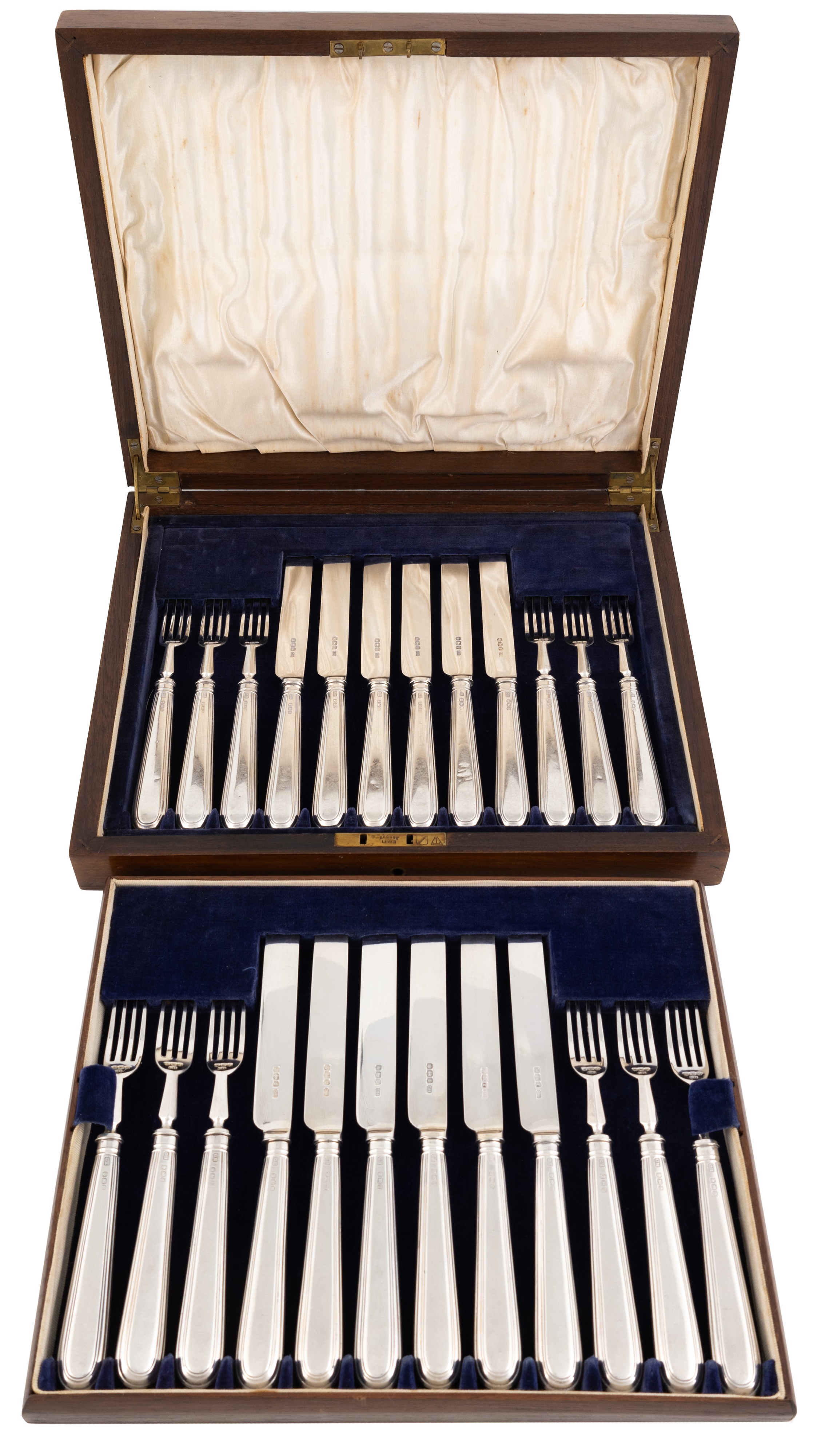 thread pattern handles, in a wooden case, length of knife 20.3cm. (24)