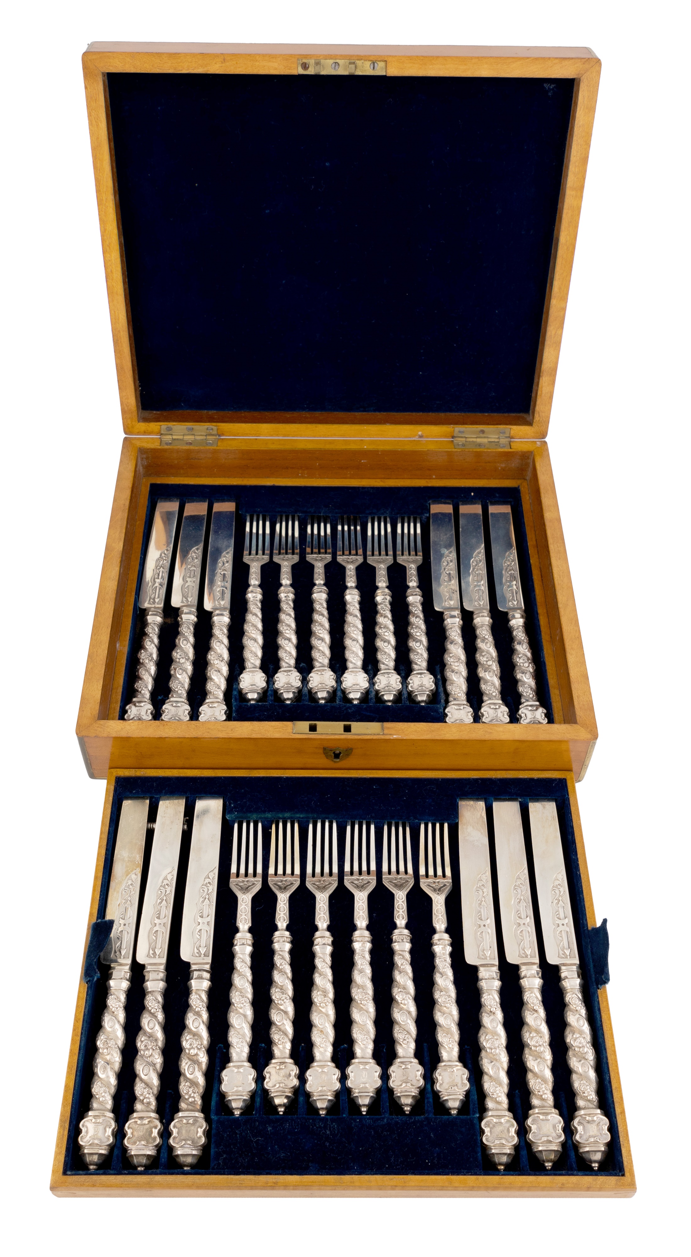 the handles with spiral and foliate handles, the terminals engraved with a crest, the blades with chased decoration, in a fitted wooden case with a lock and key. (24)