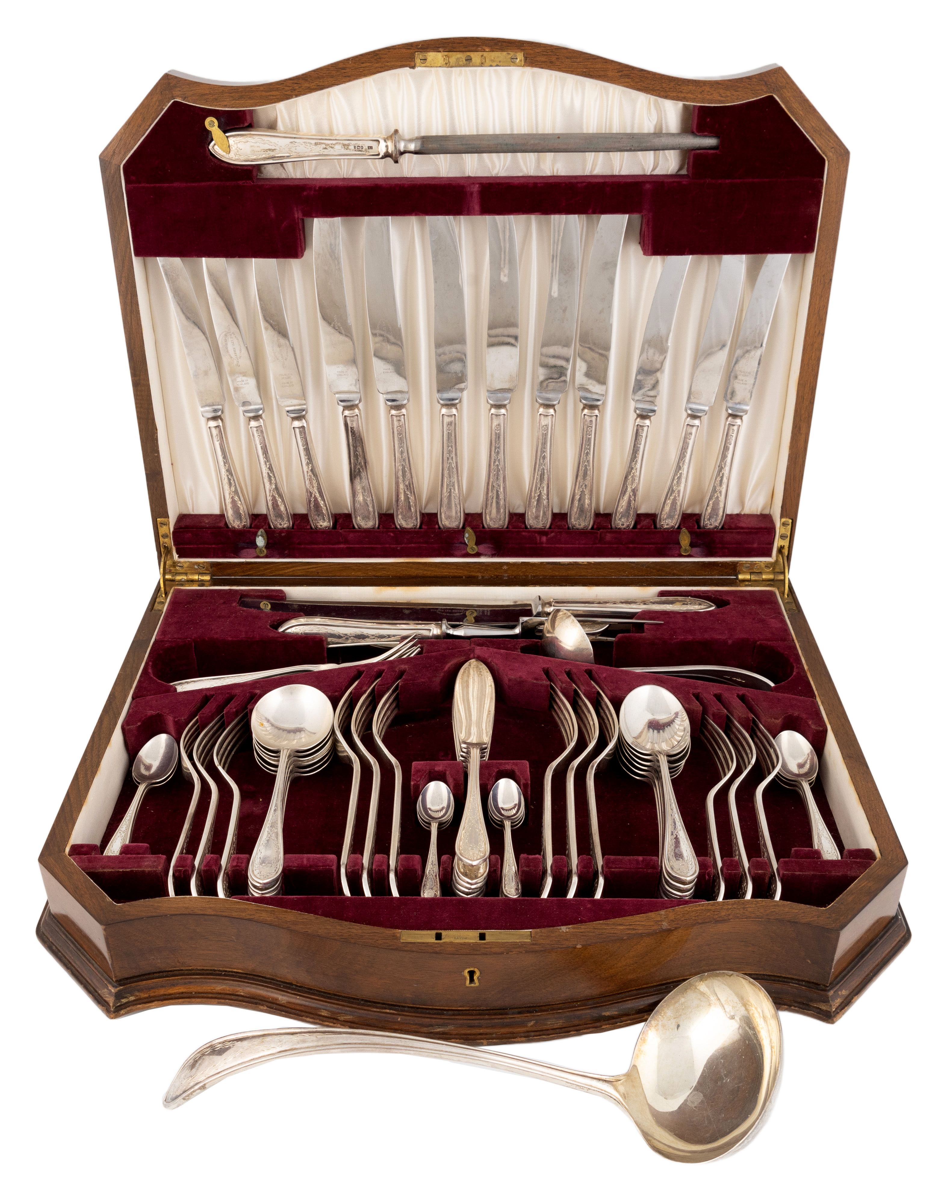 conventional form with engraved foliate decoration, comprising: six dessert spoons, six soup spoons, two tablespoons, six table forks, six fish knives, six teaspoons, six coffee spoons, eleven dessert forks, a sauce ladle, a soup ladle, six dessert knives, six table knives and a carving set, total approx. weighable 90.4oz. (64)