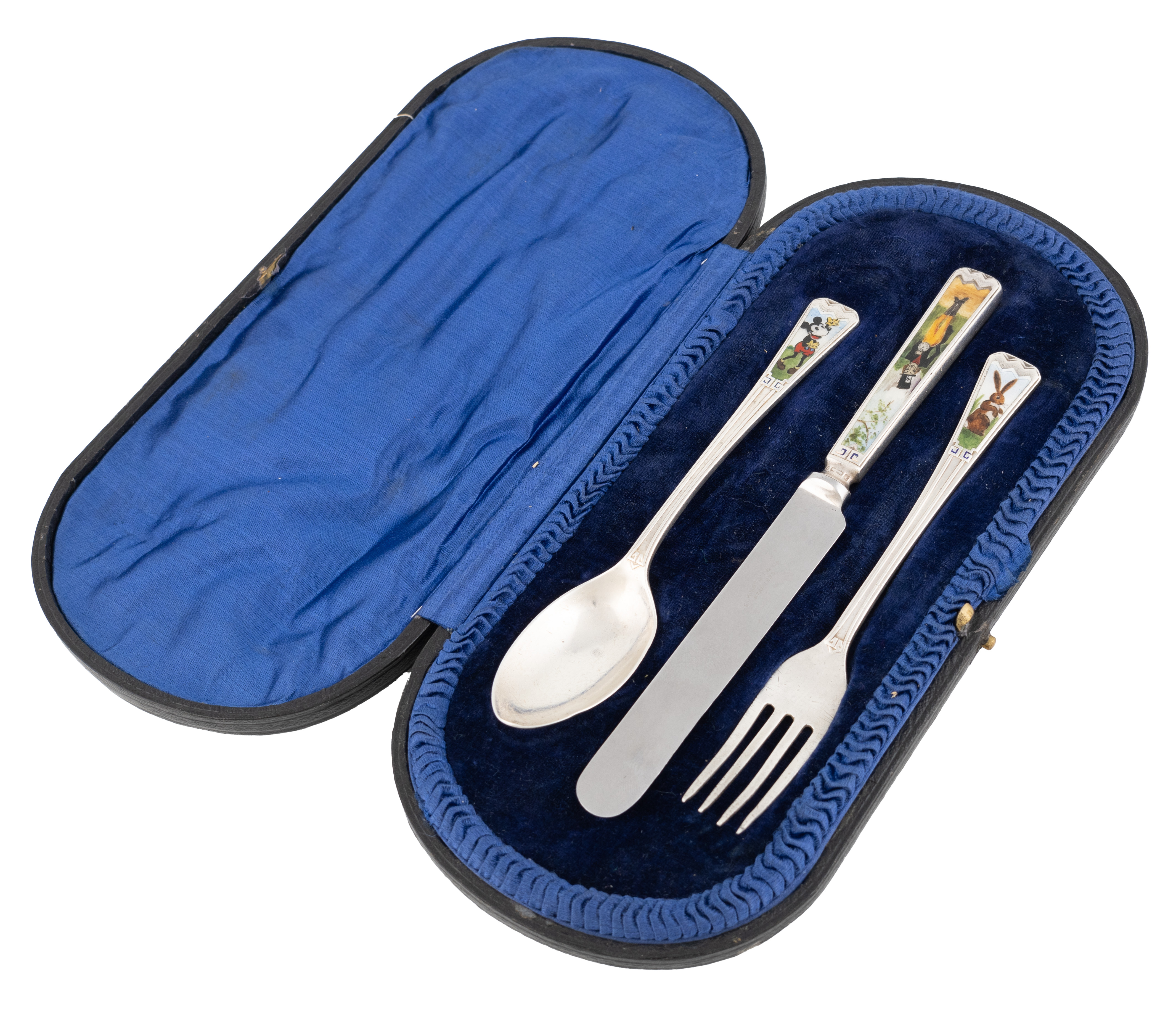 the terminals enamelled with Mickey Mouse, the Mad Hatter and the March Hare, in a associated case, approx. weighable 2.2oz.