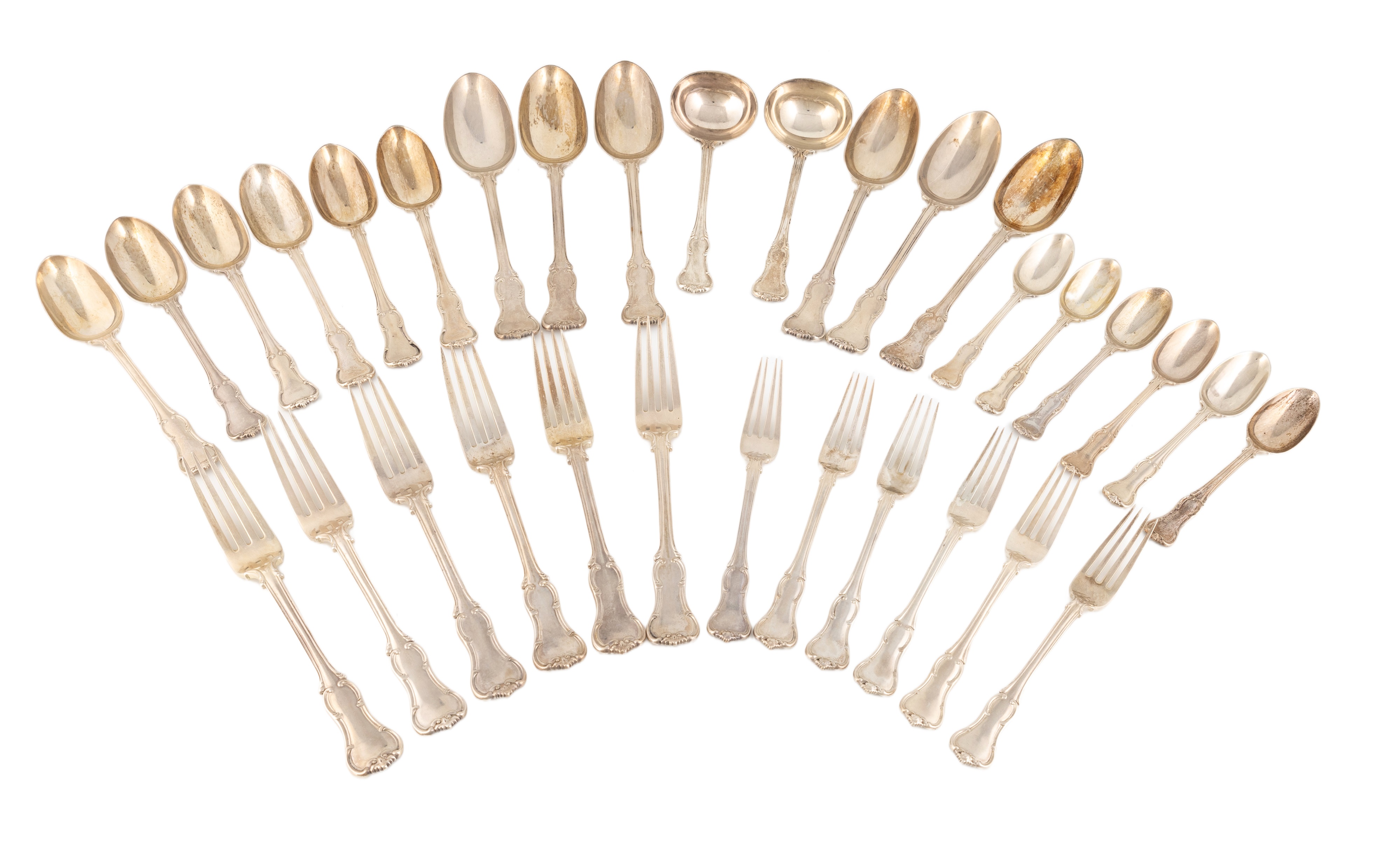 comprising: six table forks, six dessert forks, six table spoons, six teaspoons, six dessert spoons and two sauce ladles, total approx. weight 71.5oz (32)