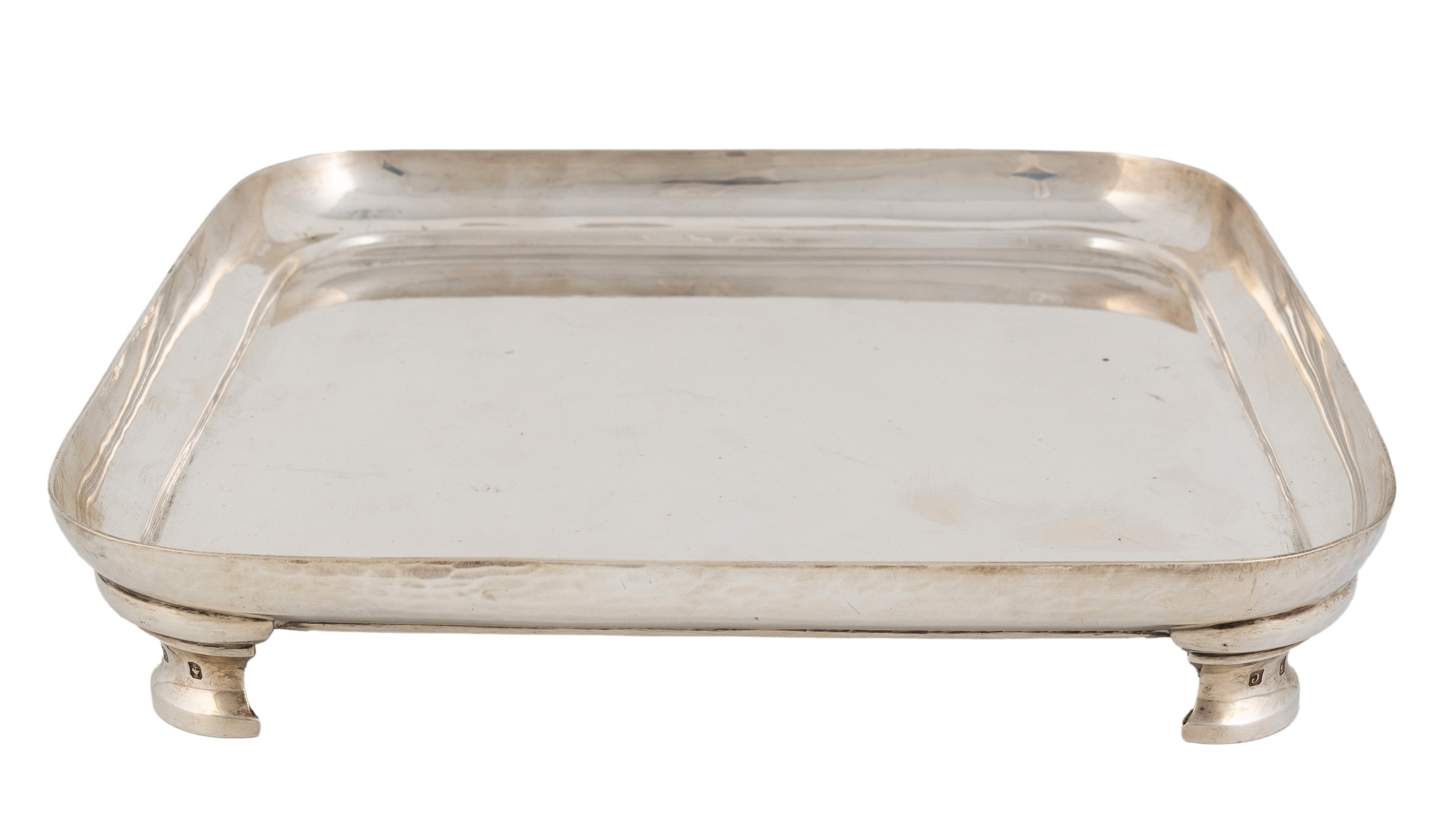 rounded plain square form, on four curved bracket feet, length 26.4cm, approx. weight 36.8oz.